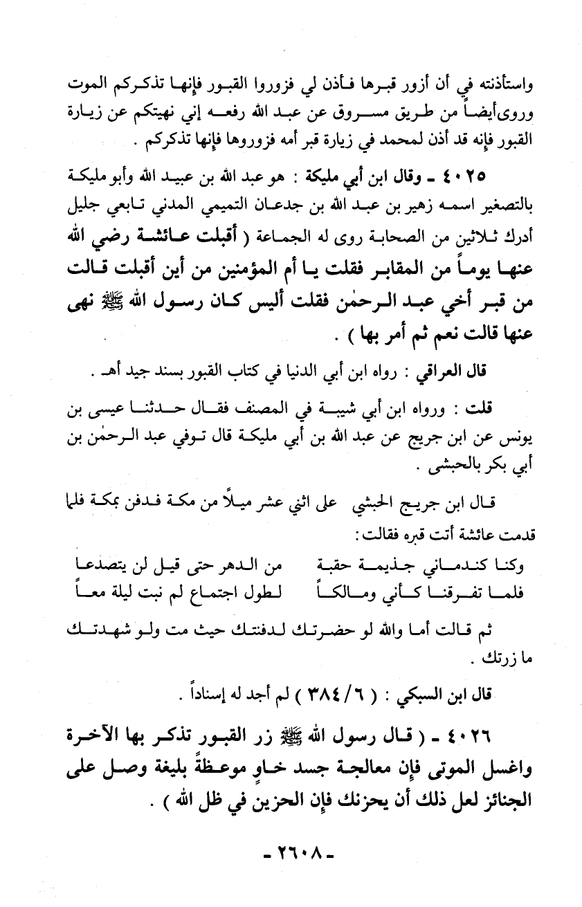 4025 - وقال ابن أبي مليكة: هو عبد الله بن عبيد الله وأبو مليكة بالتصغير اسمه زهير بن عبد الله بن جدعان التميمي المدني تابعي جليل أدرك ثلاثين من الصحابة روى له الجماعة (أقبلت عائشة رضي الله عنها يوماً من المقابر فقلت يا أم المؤمنين من أين أقبلت قالت من قبر أخي عبد الرحمن فقلت أليس كان رسول الله - صلّى الله عليه وسلم - نهى عنها قالت نعم ثم أمر بها).