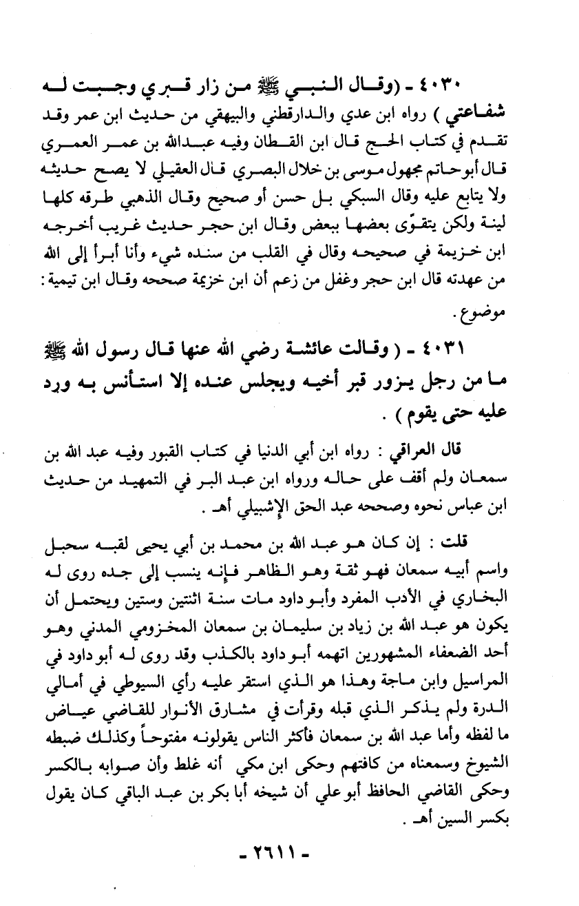 4030 - (وقال النبي - صلّى الله عليه وسلم - من زار قبري وجبت له شفاعتي) رواه ابن عدي والدارقطني والبيهقي من حديث ابن عمر وقد تقدم في كتاب الحج قال ابن القطان وفيه عبد الله بن عمر العمري قال أبو حاتم مجهول موسى بن خلال البصري قال العقيلي لا يصح حديثه ولا يتابع عليه وقال السبكي بل حسن أو صحيح وقال الذهبي طرقه كلها لينة ولكن يتقوّى بعضها ببعض وقال ابن حجر حديث غريب أخرجه ابن خزيمة في صحيحه وقال في القلب من سنده شيء وأنا أبرأ إلى الله من عهدته قال ابن حجر وغفل من زعم أن ابن خزيمة صححه وقال ابن تيمية: موضوع.