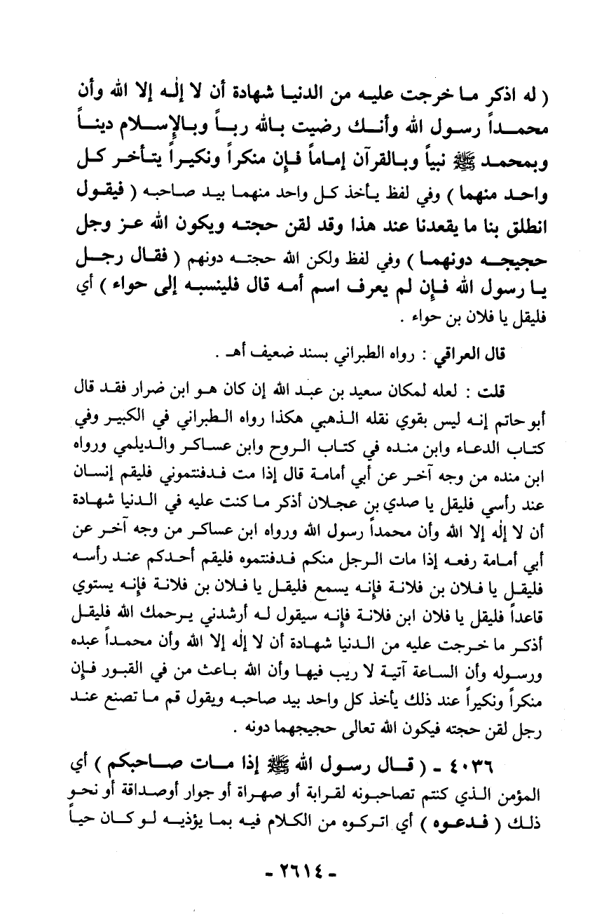 قلت: لعله لمكان سعيد بن عبد الله إن كان هو ابن ضرار فقد قال أبو حاتم إنه ليس بقوي نقله الذهبي هكذا رواه الطبراني في الكبير وفي كتاب الدعاء وابن منده في كتاب الروح وابن عساكر والديلمي ورواه ابن منده من وجه آخر عن أبي أمامة قال إذا مت فدفنتموني فليقم إنسان عند رأسي فليقل يا صدي بن عجلان أذكر ما كنت عليه في الدنيا شهادة أن لا إله إلا الله وأن محمداً رسول الله ورواه ابن عساكر من وجه آخر عن أبي أمامة رفعه إذا مات الرجل منكم فدفنتموه فليقم أحدكم عند رأسه فليقل يا فلان بن فلانة فإنه يسمع فليقل يا فلان بن فلانة فإنه يستوي قاعداً فليقل يا فلان ابن فلانة فإنه سيقول له أرشدني يرحمك الله فليقل أذكر ما خرجت عليه من الدنيا شهادة أن لا إله إلا الله وأن محمداً عبده ورسوله وأن الساعة آتية لا ريب فيها وأن الله باعث من في القبور فإن منكراً ونكيراً عند ذلك يأخذ كل واحد بيد صاحبه ويقول قم ما تصنع عند رجل لقن حجته فيكون الله تعالى حجيجهما دونه.