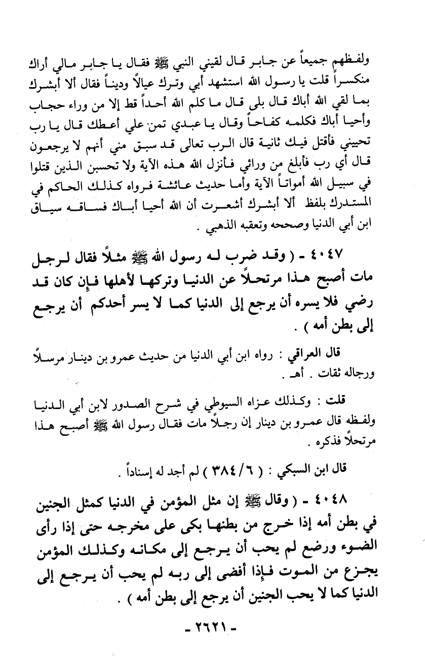 4047 - (وقد ضرب له رسول الله - صلّى الله عليه وسلم - مثلاً فقال لرجل مات أصبح هذا مرتحلاً عن الدنيا وتركها لأهلها فإن كان قد رضي فلا يسره أن يرجع إلى الدنيا كما لا يسر أحدكم أن يرجع إلى بطن أمه).