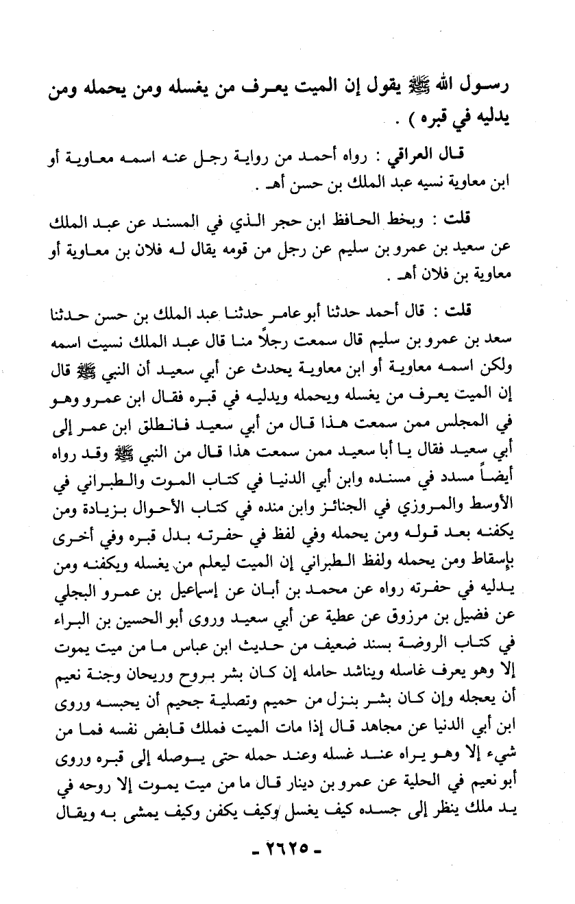 قلت: قال أحمد حدثنا أبو عامر حدثنا عبد الملك بن حسن حدثنا سعد بن عمرو بن سليم قال سمعت رجلاً منا قال عبد الملك نسيت اسمه ولكن اسمه معاوية أو ابن معاوية يحدث عن أبي سعيد أن النبي - صلّى الله عليه وسلم - قال إن الميت يعرف من يغسله ويحمله ويدليه في قبره فقال ابن عمرو وهو في المجلس ممن سمعت هذا قال من أبي سعيد فانطلق ابن عمر إلى أبي سعيد فقال يا أبا سعيد ممن سمعت هذا قال من النبي - صلّى الله عليه وسلم - وقد رواه أيضاً مسدد في مسنده وابن أبي الدنيا في كتاب الموت والطبراني في الأوسط والمروزي في الجنائز وابن منده في كتاب الأحوال بزيادة ومن يكفنه بعد قوله ومن يحمله وفي لفظ في حفرته بدل قبره وفي أخرى بإسقاط ومن يحمله ولفظ الطبراني إن الميت ليعلم من يغسله ويكفنه ومن يدليه في حفرته رواه عن محمد بن أبان عن إسماعيل بن عمرو البجلي عن فضيل بن مرزوق عن عطية عن أبي سعيد وروى أبو الحسين بن البراء في كتاب الروضة بسند ضعيف من حديث ابن عباس ما من ميت يموت إلا وهو يعرف غاسله ويناشد حامله إن كان بشر بروح وريحان وجنة نعيم أن يعجله وإن كان بشر بنزل من حميم وتصلية جحيم أن يحبسه وروى ابن أبي الدنيا عن مجاهد قال إذا مات الميت فملك قابض نفسه فما من شيء إلا وهو يراه عند غسله وعند حمله حتى يوصله إلى قبره وروى أبو نعيم في الحلية عن عمرو بن دينار قال ما من ميت يموت إلا روحه في يد ملك ينظر إلى جسده كيف يغسلكيف يكفن وكيف يمشى به ويقال