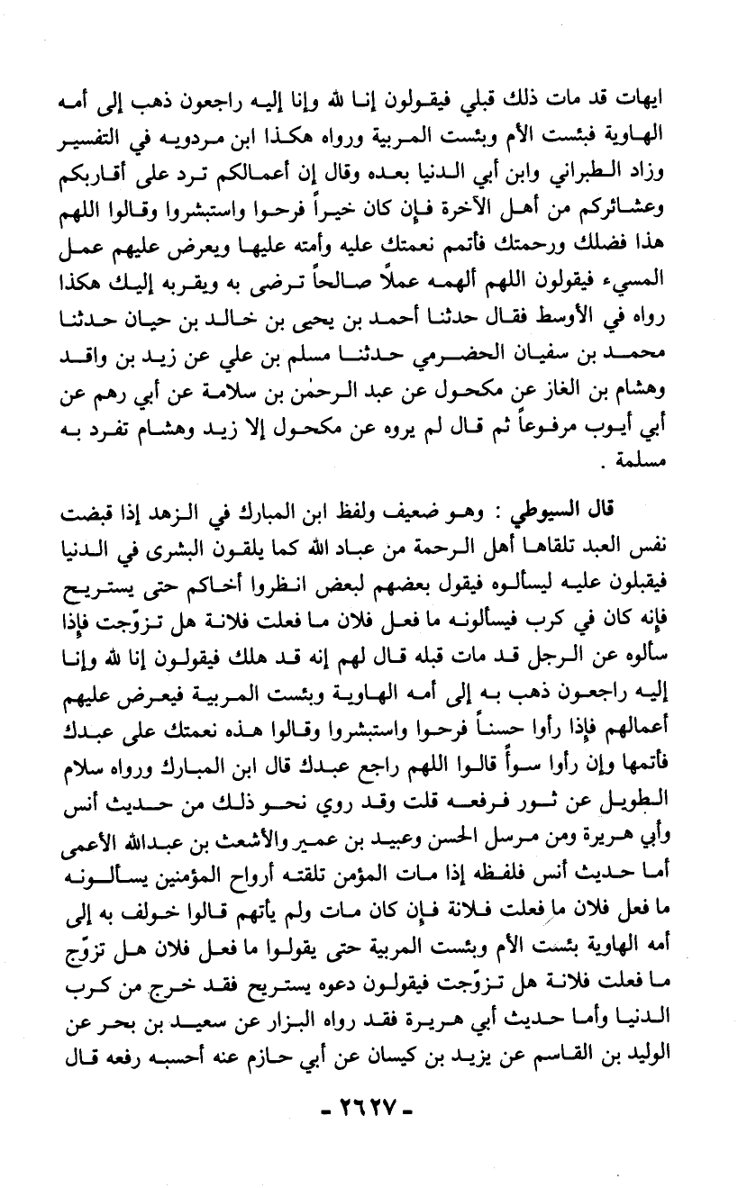 ايهات قد مات ذلك قبلي فيقولون إنا لله وإنا إليه راجعون ذهب إلى أمه الهاوية فبئست الأم وبئست المربية ورواه هكذا ابن مردويه في التفسير وزاد الطبراني وابن أبي الدنيا بعده وقال إن أعمالكم ترد على أقاربكم وعشائركم من أهل الآخرة فإن كان خيراً فرحوا واستبشروا وقالوا اللهم هذا فضلك ورحمتك فأتمم نعمتك عليه وأمته عليها ويعرض عليهم عمل المسيء فيقولون اللهم ألهمه عملاً صالحاً ترضى به ويقربه إليك هكذا رواه في الأوسط فقال حدثنا أحمد بن يحيى بن خالد بن حيان حدثنا محمد بن سفيان الحضرمي حدثنا مسلم بن علي عن زيد بن واقد وهشام بن الغاز عن مكحول عن عبد الرحمن بن سلامة عن أبي رهم عن أبي أيوب مرفوعاً ثم قال لم يروه عن مكحول إلا زيد وهشام تفرد به مسلمة.