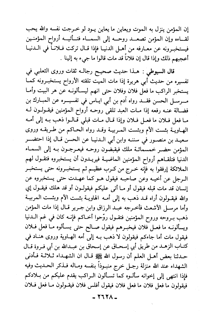 قال السيوطي: هذا حديث صحيح رجاله ثقات وروى الثعلبي في تفسيره من حديث أبي هريرة إذا مات الميت تلقته الأرواح يستخبرونه كما يستخبر الراكب ما فعل فلان وفلان حتى انهم ليسألونه عن هر البيت وأما مرسل الحسن فقد رواه آدم بن أبي إياس في تفسيره عن المبارك بن فضالة عنه رفعه إذا مات العبد تلقى روحه أرواح المؤمنين فيقولون له ما فعل فلان ما فعل فلان وإذا قال مات قبلي قالوا ذهب به إلى أمه الهاوية بئست الأم وبئست المربية وقد رواه الحاكم من طريقه وروى سعيد بن منصور في سننه وابن أبي الدنيا عن الحسن قال إذا احتضر المؤمن حضر خمسمائة ملك فيقبضون روحه فيعرجون به إلى السماء الدنيا فتلقاهم أرواح المؤمنين الماضية فيريدون أن يستخبروه فتقول لهم الملائكة إرفقوا به فإنه خرج من كرب عظيم ثم يستخبرونه حتى يستخبر الرجل عن أخيه وعن صاحبه فيقول هو كما عهدت حتى يستخبروه عن إنسان قد مات قبله فيقول أو ما أتى عليكم فيقولون أو قد هلك فيقول إي والله فيقولون أراه قد ذهب به إلى أمه الهاوية بئست الأم وبئست المربية وأما مرسل الأشعث فأخرجه عبد الرزاق وابن جرير قال إذا مات المؤمن ذهب بروحه وروح المؤمنين فتقول روّحوا أخاكم فإنه كان في غم الدنيا ويسألونه ما فعل فلان فيخبرهم فيقول صالح حتى يسألوه ما فعل فلان فيقول مات أما جاءكم فيقولون لا ذهب به إلى أمه الهاوية وروى هناد في كتاب الزهد من طريق أبي إسحاق عن إسحاق بن عبد الله بن أبي فروة قال حدثنا بعض أهل العلم أن رسول الله - صلّى الله عليه وسلم - قال أن الشهداء ثلاثة فأدنى الشهداء عند الله منزلة رجل خرج منبوذاً بنفسه وماله فذكر الحديث وفيه فإذا انتهى إلى إخوانه سألوه كما تسألون الراكب يقدم عليكم من بلادكم فيقولون ما فعل فلان ما فعل فلان فيقول أفلس فلان فيقولون ما فعل فلان