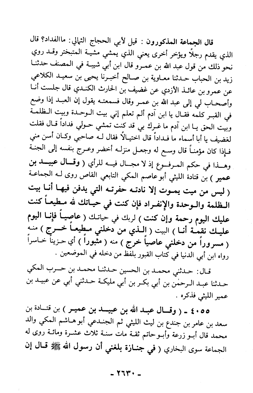 قال الجماعة المذكورون: قيل لأبي الحجاج الثمالي: ما الفداد؟ قال الذي يقدم رجلاً ويؤخر أخرى يعني الذي يمشي مشية المتبختر وقد روي نحو ذلك من قول عبد الله بن عمرو قال ابن أبي شيبة في المصنف حدثنا زيد بن الحباب حدثنا معاوية بن صالح أخبرنا يحيى بن سعيد الكلاعي عن عمرو بن عائذ الأزدي عن غضيف بن الحارث الكندي قال جلست أنا وأصحاب لي إلى عبد الله بن عمر وقال فسمعته يقول إن العبد إذا وضع في القبر كلمه فقال يا ابن آدم ألم تعلم إني بيت الوحدة وبيت الظلمة وبيت الحق يا ابن آدم ما غرك بي قد كنت تمشي حولي فداداً قال فقلت لغضيف يا أبا أسماء ما فداداً قال اختيالاً فقال له صاحبي وكان أسن مني فإذا كان مؤمناً قال وسع له وجعل منزله أخضر وعرج بنفسه إلى الجنة وهذا في حكم المرفوع إذ لا مجال فيه للرأي (وقال عبيد بن عمير) بن قتادة الليثي أبو عاصم المكي التابعي القاص روى له الجماعة (ليس من ميت يموت إلا نادته حفرته التي يدفن فيها أنا بيت الظلمة والوحدة والانفراد فإن كنت في حياتك لله مطيعاً كنت عليك اليوم رحمة وإن كنت) لربك في حياتك (عاصياً فإنا اليوم عليك نقمة أنا) البيت (الذي من دخلني مطيعاً خرج) منه (مسروراً من دخلني عاصياً خرج) منه (مثبوراً) أي حزيناً خاسراً رواه ابن أبي الدنيا في كتاب القبور بلفظ من دخله في الموضعين.