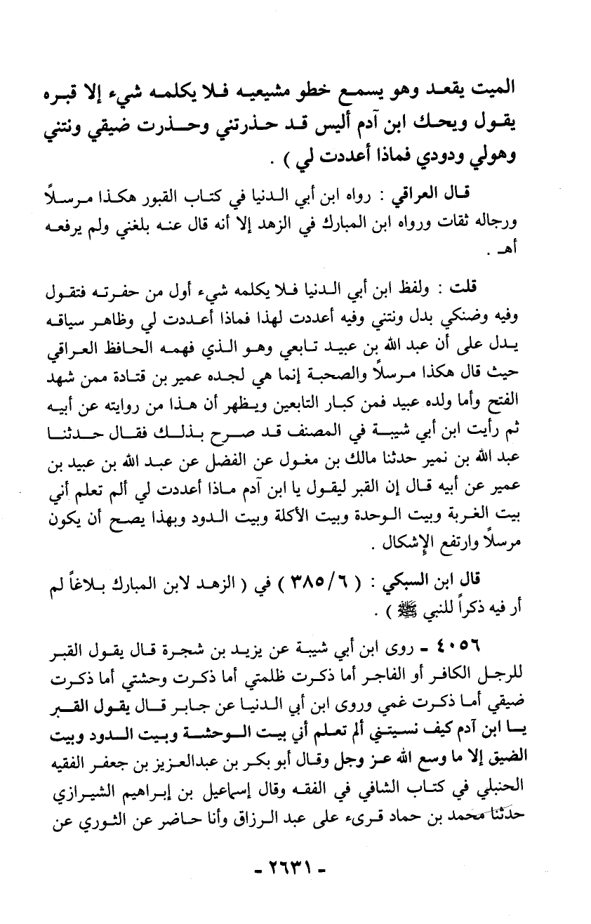 4056 - روى ابن أبي شيبة عن يزيد بن شجرة قال يقول القبر للرجل الكافر أو الفاجر أما ذكرت ظلمتي أما ذكرت وحشتي أما ذكرت ضيقي أما ذكرت غمي وروى ابن أبي الدنيا عن جابر قال يقول القبر يا ابن آدم كيف نسيتني ألم تعلم أني بيت الوحشة وبيت الدود وبيت الضيق إلا ما وسع الله عز وجل وقال أبو بكر بن عبد العزيز بن جعفر الفقيه الحنبلي في كتاب الشافي في الفقه وقال إسماعيل بن إبراهيم الشيرازي حدثنا محمد بن حماد قرئ على عبد الرزاق وأنا حاضر عن الثوري عن