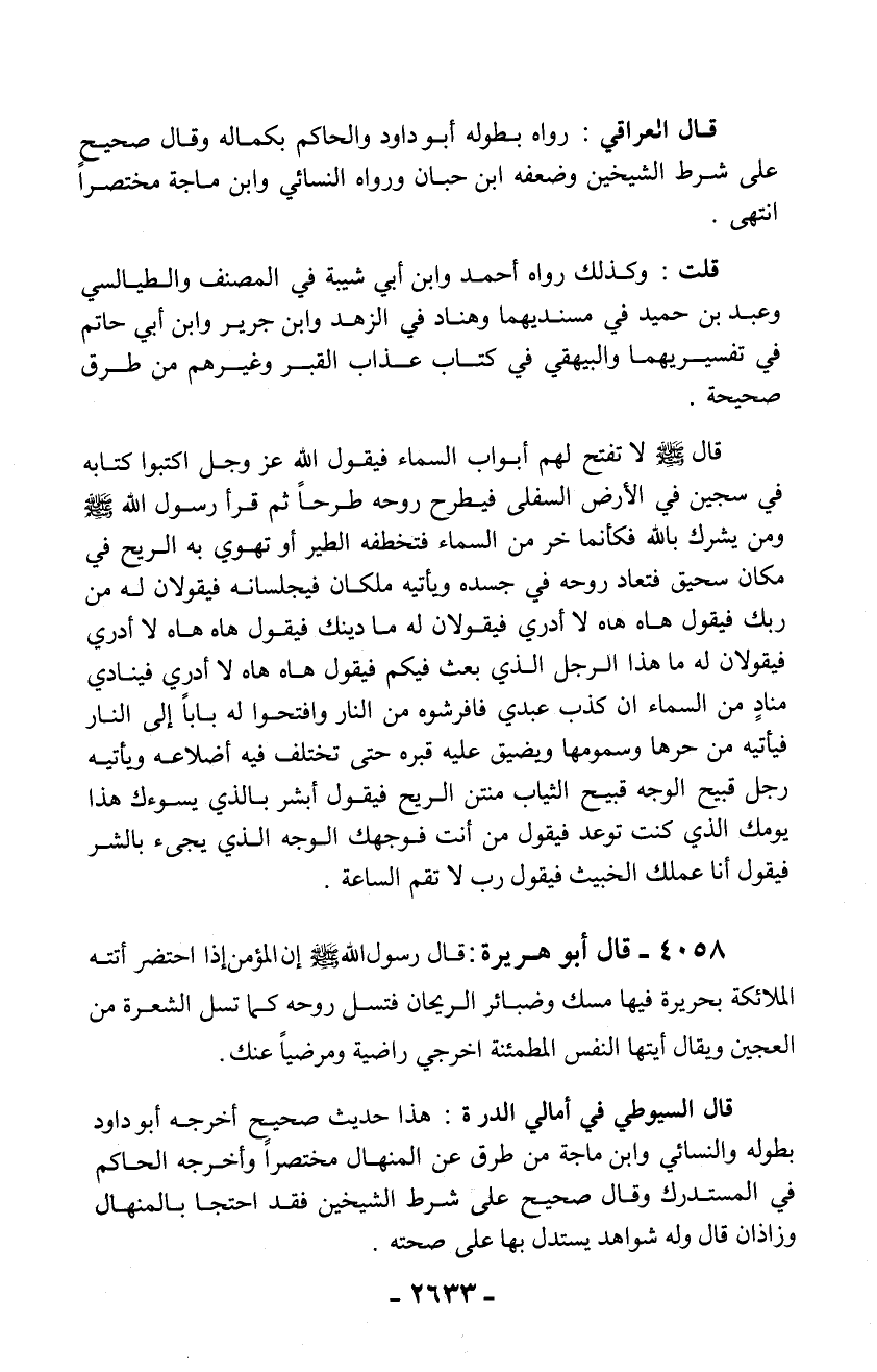 قال - صلّى الله عليه وسلم - لا تفتح لهم أبواب السماء فيقول الله عز وجل اكتبوا كتابه في سجين في الأرض السفلى فيطرح روحه طرحاً ثم قرأ رسول الله - صلّى الله عليه وسلم - ومن يشرك بالله فكأنما خر من السماء فتخطفه الطير أو تهوي به الريح في مكان سحيق فتعاد روحه في جسده ويأتيه ملكان فيجلسانه فيقولان له من ربك فيقول هاه هاه لا أدري فيقولان له ما دينك فيقول هاه هاه لا أدري فيقولان له ما هذا الرجل الذي بعث فيكم فيقول هاه هاه لا أدري فينادي منادٍ من السماء أن كذب عبدي فافرشوه من النار وافتحوا له باباً إلى النار فيأتيه من حرها وسمومها ويضيق عليه قبره حتى تختلف فيه أضلاعه ويأتيه رجل قبح الوجه قبيح الثياب منتن الريح فيقول أبشر بالذي يسوءك هذا يومك الذي كنت توعد فيقول من أنت فوجهك الوجه الذي يجىء بالشر فيقول أنا عملك الخبيث فيقول رب لا تقم الساعة.