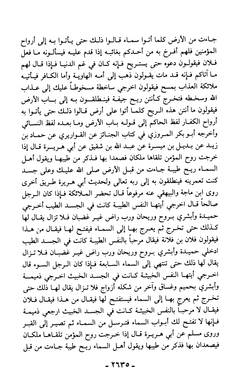 جاءت من الأرض كلما أتوا سماء قالوا ذلك حتى يأتوا به إلى أرواح المؤمنين فلهم أفرخ به من أحدكم بغائبه إذا قدم عليه فيسألونه ما فعل فلان فيقولون دعوه حتى يستريح فإنه كان في غم الدنيا فإذا قال لهم ما آتاكم فإنه قد مات يقولون ذهب إلى أمه الهاوية وأما الكافر فيأتيه ملائكة العذاب بمسح فيقولون اخرجي ساخطة مسخوطاً عليك إلى عذاب الله وسخطه فتخرج كأنتن ريح جيفة فينطلقون به إلى باب الأرض فيقولون ما أنتن هذه الريح كلما أتوا على أرض قالوا ذلك حتى يأتوا به أرواح الكفار لفظ الحاكم إلى قوله باب الأرض وما بعده لفظ النسائي وأخرجه أبو بكر المروزي في كتاب الجنائز عن القواريري عن حماد بن زيد عن بديل بن ميسرة عن عبد الله بن شقيق عن أبي هريرة قال إذا خرجت روح المؤمن تلقاها ملكان فصعدا بها فذكر من طيبها ويقول أهل السماء ريح طيبة جاءت من قبل الأرض صلّى الله عليك وعلى جسد كنت تعمرينه فينطلقون به إلى ربه تعالى ولحديث أبي هريرة طريق أخرى روى ابن ماجة والبيهقي عنه مرفوعاً قال تحضر الملائكة فإذا كان الرجل صالحاً قال اخرجي أيتها النفس الطيبة كانت في الجسد الطيب اخرجي حميدة وأبشري بروح وريحان ورب راض غير غضبان فلا تزال يقال لها كذلك حتى تخرج ثم يعرج بها إلى السماء فيفتح لها فيقال من هذا فيقولون فلان بن فلانة فيقال مرحباً بالنفس الطيبة كانت في الجسد الطيب ادخلي حميدة وأبشري بروح وريحان ورب راض غير غضبان فلا تزال يقال لها ذلك حتى تنتهي إلى السماء السابعة فإذا كان الرجل السوء قال اخرجي أيتها النفس الخبيثة كانت في الجسد الخبيث اخرجي ذميمة وأبشري بحميم وغساق وآخر من شكله أزواج فلا تزال يقال لها ذلك حتى تخرج ثم يعرج بها إلى السماء فيستفتح لها فيقال من هذا فيقال فلان فيقال لا مرحباً بالنفس الخبيثة كانت في الجسد الخبيث ارجعي ذميمة فإنها لا تفتح لك أبواب السماء فترسل من السماء ثم تصير إلى القبر وروى مسلم عن أبي هريرة قال إذا خرجت روح المؤمن تلقاها ملكان فيصعدان بها فذكر من طيبها ويقول أهل السماء ريح طيبة جاءت من قبل