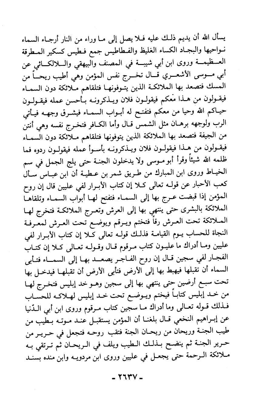يسأل الله أن يديم ذلك عليه فلا يصل إلى ما وراء من النار أرجاء السماء نواحيها والبجاد الكساء الغليظ والفطاطيس جمع فطيس كسكير المطرقة العظيمة وروى ابن أبي شيبة في المصنف والبيهقي واللالكائي عن أبي موسى الأشعري قال تخرج نفس المؤمن وهي أطيب ريحاً من المسك فتصعد بها الملائكة الذين يتوفونها فتلقاهم ملائكة دون السماء فيقولون من هذا فعكم فيقولون فلان ويذكرونه بأحسن عمله فيقولون حياكم الله وحيا من معكم فتفتح له أبواب السماء فيشرق وجهه فيأتي الرب ولوجهه برهان مثل الشمس قال وأما الكافر فتخرج نفسه وهي أنتن من الجيفة فتصعد بها الملائكة الذين يتوفونها فتلقاهم ملائكة دون السماء فيقولون من هذا فيقولون فلان ويذكرونه بأسوأ عمله فيقولون ردوه فما ظلمه الله شيئاً وقرأ أبو موسى ولا يدخلون الجنة حتى يلج الجمل في سم الخياط وروى ابن المبارك من طريق شمر بن عطية أن ابن عباس سأل كعب الأحبار عن قوله تعالى كلا إن كتاب الأبرار لفي عليين قال إن روح المؤمن إذا قبضت عرج بها إلى السماء فتفتح لها أبواب السماء وتلقاها الملائكة بالبشرى حتى ينتهي بها إلى العرش وتعرج الملائكة فتخرج لها الملائكة تحت العرش رقاً فتختم ويرقم ويوضع تحت العرش لمعرفة النجاة للحساب يوم القيامة فذلك قوله تعالى كلا إن كتاب الأبرار لفي عليين وما أدراك ما عليون كتاب مرقوم قال وقوله تعالى كلا إن كتاب الفجار لفي سجين قال إن روح الفاجر يصعد بها إلى السماء فتأبى السماء أن تقبلها فيهبط بها إلى الأرض فتأبى الأرض أن تقبلها فيدخل بها تحت سبع أرضين حتى ينتهي بها إلى سجين وهو خد إبليس فتخرج لها من خد إبليس كتاباً فيختم ويوضع تحت خد إبليس لهلاكه للحساب فذلك قوله تعالى وما أدراك ما سجين كتاب مرقوم وروى ابن أبي الدّنيا عن إبراهيم النخعي قال بلغنا أن المؤمن يستقبل عند موته بطيب من طيب الجنة وريحان من ريحان الجنة فتقب روحه فتجعل في حرير من حرير الجنة ثم ينضح بذلك الطيب ويلف في الريحان ثم ترتقي به ملائكة الرحمة حتى يجعل في عليين وروى ابن مردويه وابن منده بسند