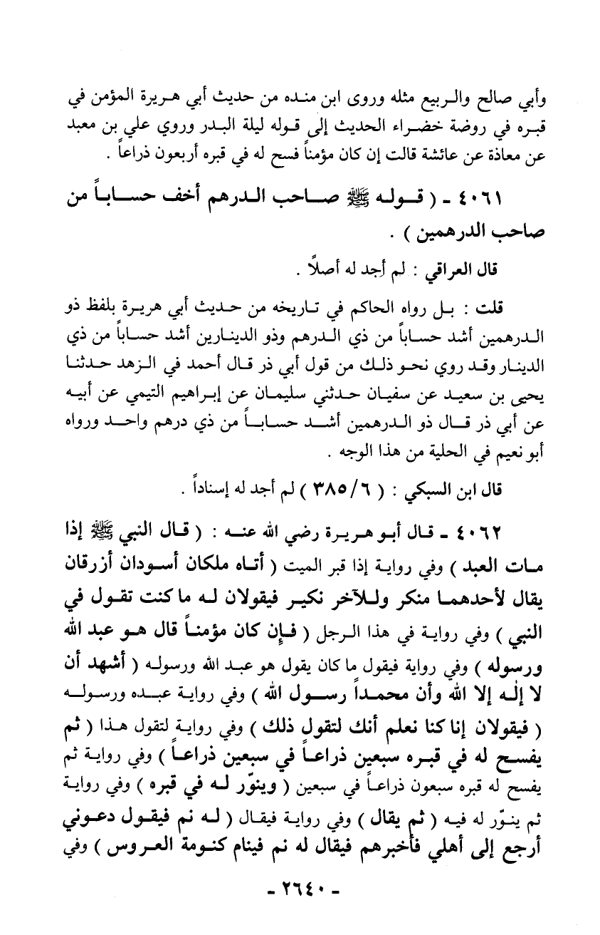 4062 - قال أبو هريرة رضي الله عنه: (قال النبي - صلّى الله عليه وسلم - إذا مات العبد) وفي رواية إذا قبر الميت (أتاه ملكان أسودان أزرقان يقال لأحدهما منكر وللآخر نكير فيقولان له ما كنت تقول في النبي) وفي رواية في هذا الرجل (فإن كان مؤمناً قال هو عبد الله ورسوله) وفي رواية فيقول ما كان يقول هو عبد الله ورسوله (أشهد أن لا إله إلا الله وأن محمداً رسول الله) وفي رواية عبده ورسوله (فيقولان إنا كنا نعلم أنك لتقول ذلك) وفي رواية لتقول هذا (ثم يفسح له في قبره سبعين ذراعاً في سبعين ذراعاً) وفي رواية ثم يفسح له قبره سبعون ذراعاً في سبعين (وينوّر له في قبره) وفي رواية ثم ينوّر له فيه (ثم يقال) وفي رواية فيقال (له نم فيقول دعوني أرجع إلى أهلي فأخبرهم فيقال له نم فينام كنومة العروس) وفي