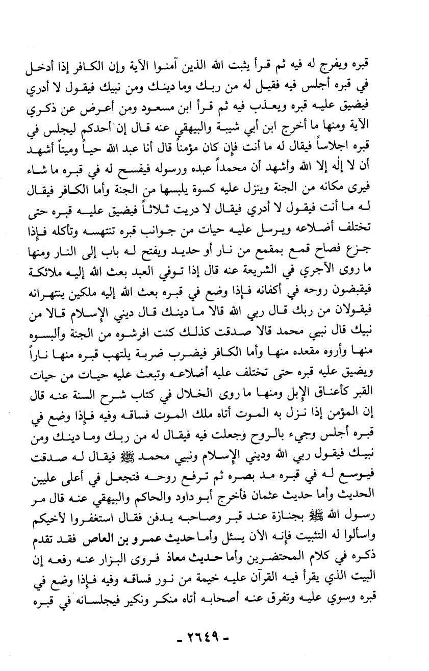 قبره ويفرج له فيه ثم قرأ يثبت الله الذين آمنوا الآية وإن الكافر إذا أدخل في قبره أجلس فيه فقيل له من ربك وما دينك ومن نبيك فيقول لا أدري فيضيق عليه قبره ويعذب فيه ثم قرأ ابن مسعود ومن أعرض عن ذكري الآية ومنها ما أخرج ابن أبي شيبة والبيهقي عنه قال إن أحدكم ليجلس في قبره اجلاساً فيقال له ما أنت فإن كان مؤمناً قال أنا عبد الله حياً وميتاً أشهد أن لا إله إلا الله وأشهد أن محمداً عبده ورسوله فيفسح له في قبره ما شاء فيرى مكانه من الجنة وينزل عليه كسوة يلبسها من الجنة وأما الكافر فيقال له ما أنت فيقول لا أدري فيقال لا دريت ثلاثاً فيضيق عليه قبره حتى تختلف أضلاعه ويرسل عليه حيات من جوانب قبره تنتهسه وتأكله فإذا جزع فصاح قمع بمقمع من نار أو حديد ويفتح له باب إلى النار ومنها ما روى الآجري في الشريعة عنه قال إذا توفي العبد بعث الله إليه ملائكة فيقبضون روحه في أكفانه فإذا وضع في قبره بعث الله إليه ملكين ينتهرانه فيقولان من ربك قال ربي الله قالا ما دينك قال ديني الإسلام قالا من نبيك قال نبيي محمد قالا صدقت كذلك كنت افرشوه من الجنة وألبسوه منها وأروه مقعده منها وأما الكافر فيضرب ضربة يلتهب قبره منها ناراً ويضيق عليه قبره حتى تختلف عليه أضلاعه وتبعث عليه حيات من حيات القبر كأعناق الإبل ومنها ما روى الخلال في كتاب شرح السنة عنه قال إن المؤمن إذا نزل به الموت أتاه ملك الموت فساقه وفيه فإذا وضع في قبره أجلس وجيء بالروح وجعلت فيه فيقال له من ربك وما دينك ومن نبيك فيقول ربي الله وديني الإسلام ونبي محمد - صلّى الله عليه وسلم - فيقال له صدقت فيوسع له في قبره مد بصره ثم ترفع روحه فتجعل في أعلى عليين الحديث وأما حديث عثمان فأخرج أبو داود والحاكم والبيهقي عنه قال مر رسول الله - صلّى الله عليه وسلم - بجنازة عند قبر وصاحبه يدفن فقال استغفروا لأخيكم واسألوا له التثبيت فإنه الآن يسئل وأما حديث عمرو بن العاص فقد تقدم ذكره في كلام المحتضرين وأما حديث معاذ فروى البزار عنه رفعه إن البيت الذي يقرأ فيه القرآن عليه خيمة من نور فساقه وفيه فإذا وضع في قبره وسوي عليه وتفرق عنه أصحابه أتاه منكر ونكير فيجلسانه في قبره