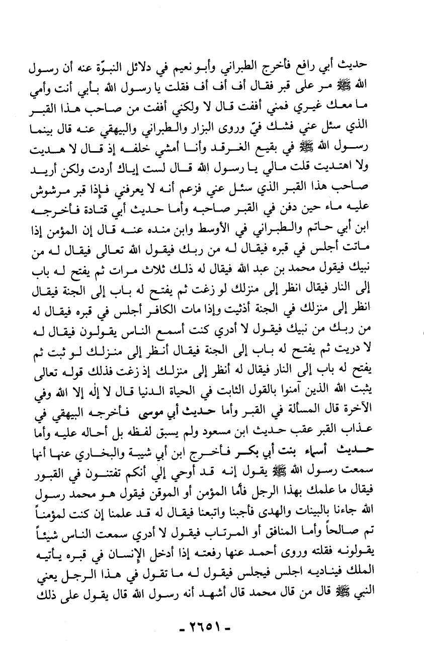 حديث أبي رافع فأخرج الطبراني وأبو نعيم في دلائل النبوّة عنه أن رسول الله - صلّى الله عليه وسلم - مر على قبر فقال أف أف أف فقلت يا رسول الله بأبي أنت وأمي ما معك غيري فمني أففت قال لا ولكني أففت من صاحب هذا القبر الذي سئل عني فشك فيّ وروى البزار والطبراني والبيهقي عنه قال بينما رسول الله - صلّى الله عليه وسلم - في بقيع الغرقد وأنا أمشي خلفه إذ قال لا هديت ولا اهتديت قلت مالي يا رسول الله قال لست إياك أردت ولكن أريد صاحب هذا القبر الذي سئل عني فزعم أنه لا يعرفني فإذا قبر مرشوش عليه ماء حين دفن في القبر صاحبه وأما حديث أبي قتادة فأخرجه ابن أبي حاتم والطبراني في الأوسط وابن منده عنه قال إن المؤمن إذا مات أجلس في قبره فيقال له من ربك فيقول الله تعالى فيقال له من نبيك فيقول محمد بن عبد الله فيقال له ذلك ثلاث مرات ثم يفتح له باب إلى النار فيقال انظر إلى منزلك لو زغت ثم يفتح له باب إلى الجنة فيقال انظر إلى منزلك في الجنة أذثيت وإذا مات الكافر أجلس في قبره فيقال له من ربك من نبيك فيقول لا أدري كنت أسمع الناس يقولون فيقال له لا دريت ثم يفتح له باب إلى الجنة فيقال أنظر إلى منزلك لو ثبت ثم يفتح له باب إلى النار فيقال له أنظر إلى منزلك إذ زغت فذلك قوله تعالى يثبت الله الذين آمنوا بالقول الثابت في الحياة الدنيا قال لا إله إلا الله وفي الآخرة قال المسألة في القبر وأما حديث أبي موسى فأخرجه البيهقي في عذاب القبر عقب حديث ابن مسعود ولم يسبق لفظه بل أحاله عليه وأما حديث أسماء بنت أبي بكر فأخرج ابن أبي شيبة والبخاري عنها أنها سمعت رسول الله - صلّى الله عليه وسلم - يقول إنه قد أوحي إلي أنكم تفتنون في القبور فيقال ما علمك بهذا الرجل فأمّا المؤمن أو الموقن فيقول هو محمد رسول الله جاءنا بالبينات والهدى فأجبنا واتبعنا فيقال له قد علمنا إن كنت لمؤمناً تم صالحاً وأما المنافق أو المرتاب فيقول لا أدري سمعت الناس شيئاً يقولونه فقلته وروى أحمد عنها رفعته إذا أدخل الإنسان في قبره يأتيه الملك فيناديه اجلس فيجلس فيقول له ما تقول في هذا الرجل يعني النبي - صلّى الله عليه وسلم - قال من قال محمد قال أشهد أنه رسول الله قال يقول على ذلك