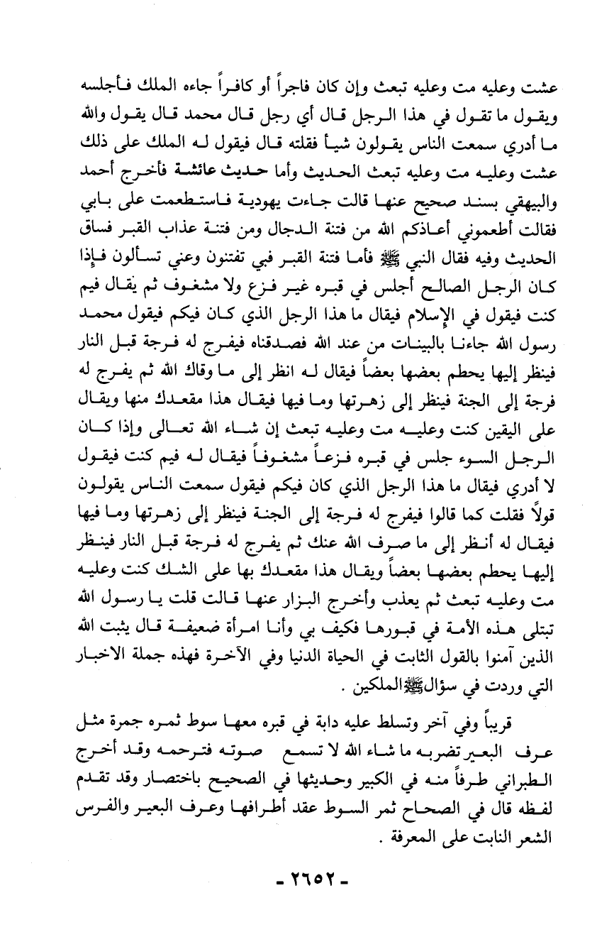 عشت وعليه مت وعليه تبعث وإن كان فاجراً أو كافراً جاءه الملك فأجلسه ويقول ما تقول في هذا الرجل قال أي رجل قال محمد قال يقول والله ما أدري سمعت الناس يقولون شيأ فقلته قال فيقول له الملك على ذلك عشت وعليه مت وعليه تبعث الحديث وأما حديث عائشة فأخرج أحمد والبيهقي بسند صحيح عنها قالت جاءت يهودية فاستطعمت على بابي فقالت أطعموني أعاذكم الله من فتنة الدجال ومن فتنة عذاب القبر فساق الحديث وفيه فقال النبي - صلّى الله عليه وسلم - فأما فتنة القبر فبي تفتنون وعني تسألون فإذا كان الرجل الصالح أجلس في قبره غير فزع ولا مشغوف ثم يقال فيم كنت فيقول في الإسلام فيقال ما هذا الرجل الذي كان فيكم فيقول محمد رسول الله جاءنا بالبينات من عند الله فصدقناه فيفرج له فرجة قبل النار فينظر إليها يحطم بعضها بعضاً فيقال له انظر إلى ما وقاك الله ثم يفرج له فرجة إلى الجنة فينظر إلى زهرتها وما فيها فيقال هذا مقعدك منها ويقال على اليقين كنت وعليه مت وعليه تبعث إن شاء الله تعالى وإذا كان الرجل السوء جلس في قبره فزعاً مشغوفاً فيقال له فيم كنت فيقول لا أدري فيقال ما هذا الرجل الذي كان فيكم فيقول سمعت الناس يقولون قولاً فقلت كما قالوا فيفرج له فرجة إلى الجنة فينظر إلى زهرتها وما فيها فيقال له أنظر إلى ما صرف الله عنك ثم يفرج له فرجة قبل النار فينظر إليها يحطم بعضها بعضاً ويقال هذا مقعدك بها على الشك كنت وعليه مت وعليه تبعث ثم يعذب وأخرج البزار عنها قالت قلت يا رسول الله تبتلى هذه الأمة في قبورها فكيف بي وأنا امرأة ضعيفة قال يثبت الله الذين آمنوا بالقول الثابت في الحياة الدنيا وفي الآخرة فهذه جملة الأخبار التي وردت في سؤال - صلّى الله عليه وسلم - الملكين.