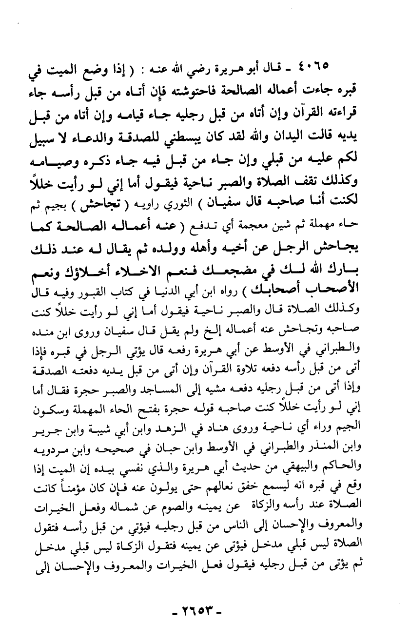 4065 - قال أبو هريرة رضي الله عنه: (إذا وضع الميت في قبره جاءت أعماله الصالحة فاحتوشته فإن أتاه من قبل رأسه جاء قراءته القرآن وإن أتاه من قبل رجليه جاء قيامه وإن أتاه من قبل يديه قالت اليدان والله لقد كان يبسطني للصدقة والدعاء لا سبيل لكم عليه من قبلي وإن جاء من قبل فيه جاء ذكره وصيامه وكذلك تقف الصلاة والصبر ناحية فيقول أما إني لو رأيت خللاً لكنت أنا صاحبه قال سفيان) الثوري راويه (تجاحش) بجيم ثم حاء مهملة ثم شين معجمة أي تدفع (عنه أعماله الصالحة كما يجاحش الرجل عن أخيه وأهله وولده ثم يقال له عند ذلك بارك الله لك في مضجعك فنعم الأخلاء أخلاؤك ونعم الأصحاب أصحابك) رواه ابن أبي الدنيا في كتاب القبور وفيه قال وكذلك الصلاة قال والصبر ناحية فيقول أما إني لو رأيت خللاً كنت صاحبه وتجاحش عنه أعماله إلخ ولم يقل قال سفيان وروى ابن منده والطبراني في الأوسط عن أبي هريرة رفعه قال يؤتي الرجل في قبره فإذا أتى من قبل رأسه دفعه تلاوة القرآن وإن أتى من قبل يديه دفعته الصدقة وإذا أتى من قبل رجليه دفعه مشيه إلى المساجد والصبر حجرة فقال أما إني لو رأيت خللاً كنت صاحبه قوله حجرة بفتح الحاء المهملة وسكون الجيم وراء أي ناحية وروى هناد في الزهد وابن أبي شيبة وابن جرير وابن المنذر والطبراني في الأوسط وابن حبان في صحيحه وابن مردويه والحاكم والبيهقي من حديث أبي هريرة والذي نفسي بيده إن الميت إذا وقع في قبره انه ليسمع خفق نعالهم حتى يولون عنه فإن كان مؤمناً كانت الصلاة عند رأسه والزكاة عن يمينه والصوم عن شماله وفعل الخيرات والمعروف والإحسان إلى الناس من قبل رجليه فيؤتي من قبل رأسه فتقول الصلاة ليس قبلي مدخل فيؤتى عن يمينه فتقول الزكاة ليس قبلي مدخل ثم يؤتى من قبل رجليه فيقول فعل الخيرات والمعروف والإحسان إلى