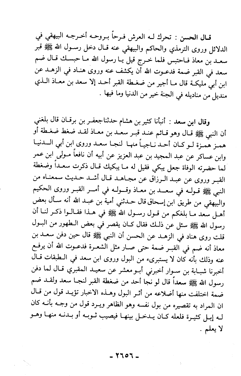 وقال ابن سعد: أنبأنا كثير بن هشام حدثنا جعفر بن برقان قال بلغني أن النبي - صلّى الله عليه وسلم - قال وهو قائم عند قبر سعد بن معاذ لقد ضغط ضغطة أو همز همزة لو كان أحد ناجياً منها لنجا سعد وروى ابن أبي الدنيا وابن عساكر عن عبد المجيد بن عبد العزيز عن أبيه أن نافعاً مولى ابن عمر ْلما حضرته الوفاة جعل يبكي فقيل له ما يبكيك قال ذكرت سعداً وضغطة القبر وروى عن عبد الرزاق عن مجاهد قال أشد حديث سمعناه من النبي - صلّى الله عليه وسلم - قوله في سعد بن معاذ وقوله في أمر القبر وروى الحكيم والبيهقي من طريق ابن إسحاق قال حدثني أمية بن عبد الله أنه سأل بعض أهل سعد ما بلغكم من قول رسول الله - صلّى الله عليه وسلم - في هذا فقالوا ذكر لنا أن رسول الله - صلّى الله عليه وسلم - سئل عن ذلك فقال كان يقصر في بعض الطهور من البول قلت روى هناد في الزهد عن الحسن أن النبي - صلّى الله عليه وسلم - قال حين دفن سعد بن معاذ أنه ضم في القبر ضمة حتى صار مثل الشعرة فدعوت الله أن يرفع عنه وذلك بأنه كان لا يستبرئ من البول وروى ابن سعد في الطبقات قال أخبرنا شبابة بن سوار أخبرني أبو معشر عن سعيد المقبري قال لما دفن رسول الله - صلّى الله عليه وسلم - سعداً قال لو نجا أحد من ضغطة القبر لنجا سعد ولقد ضم ضمة اختلفت منها أضلاعه من أثر البول وهذه الأخبار تؤيد قول من قال أن المراد به تقصيره من بول نفسه وهو الظاهر ويرد قول من وجه بأنه كان له إبل كثيرة فلعله كان يدخل بينها فيصيب ثوبه أو بدنه منها وهو لا يعلم.