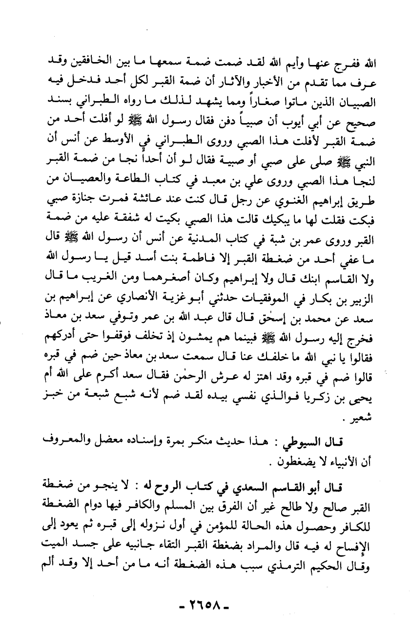 قال أبو القاسم السعدي في كتاب الروح له: لا ينجو من ضغطة القبر صالح ولا طالح غير أن الفرق بين المسلم والكافر فيها دوام الضغطة للكافر وحصول هذه الحالة للمؤمن في أول نزوله إلى قبره ثم يعود إلى الإفساح له فيه قال والمراد بضغطة القبر التقاء جانبيه على جسد الميت وقال الحكيم الترمذي سبب هذه الضغطة أنه ما من أحد إلا وقد ألم
