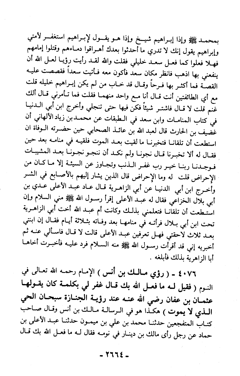 4076 - (رؤي مالك بن أنس) الإمام رحمه الله تعالى في النوم (فقيل له ما فعل الله بك قال غفر لي بكلمة كان يقولها عثمان بن عفان رضي الله عنه عند رؤية الجنازة سبحان الحي الذي لا يموت) هكذا هو في الرسالة مالك بن أنس وقال صاحب كتاب المتفجعين حدثنا محمد بن علي بن ميمون حدثنا عبد الأعلى بن حماد عن رجل رأى مالك بن دينار في نومه فقال له ما فعل الله بك قال