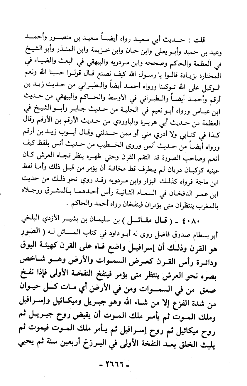 4080 - (قال مقاتل) بن سليمان بن بشير الأزدي البلخي أبو بسطام صدوق فاضل روى له أبو داود في كتاب المسائل له (الصور هو القرن وذلك أن إسرافيل واضع فاه على القرن كهيئة البوق ودائرة رأس القرن كعرض السماوات والأرض وهو شاخص بصره نحو العرش ينتظر متى يؤمر فينفخ النفخة الأولى فإذا نفخ صعق من في السماوات ومن في الأرض أي مات كل حيوان من شدة الفزع إلا من شاء الله وهو جبريل وميكائيل وإسرافيل وملك الموت ثم يأمر ملك الموت أن يقبض روح جبريل ثم روح ميكائيل ثم روح إسرافيل ثم يآمر ملك الموت فيموت ثم يلبث الخلق بعد النفخة الأولى في البرزخ أربعين سنة ثم يحيي