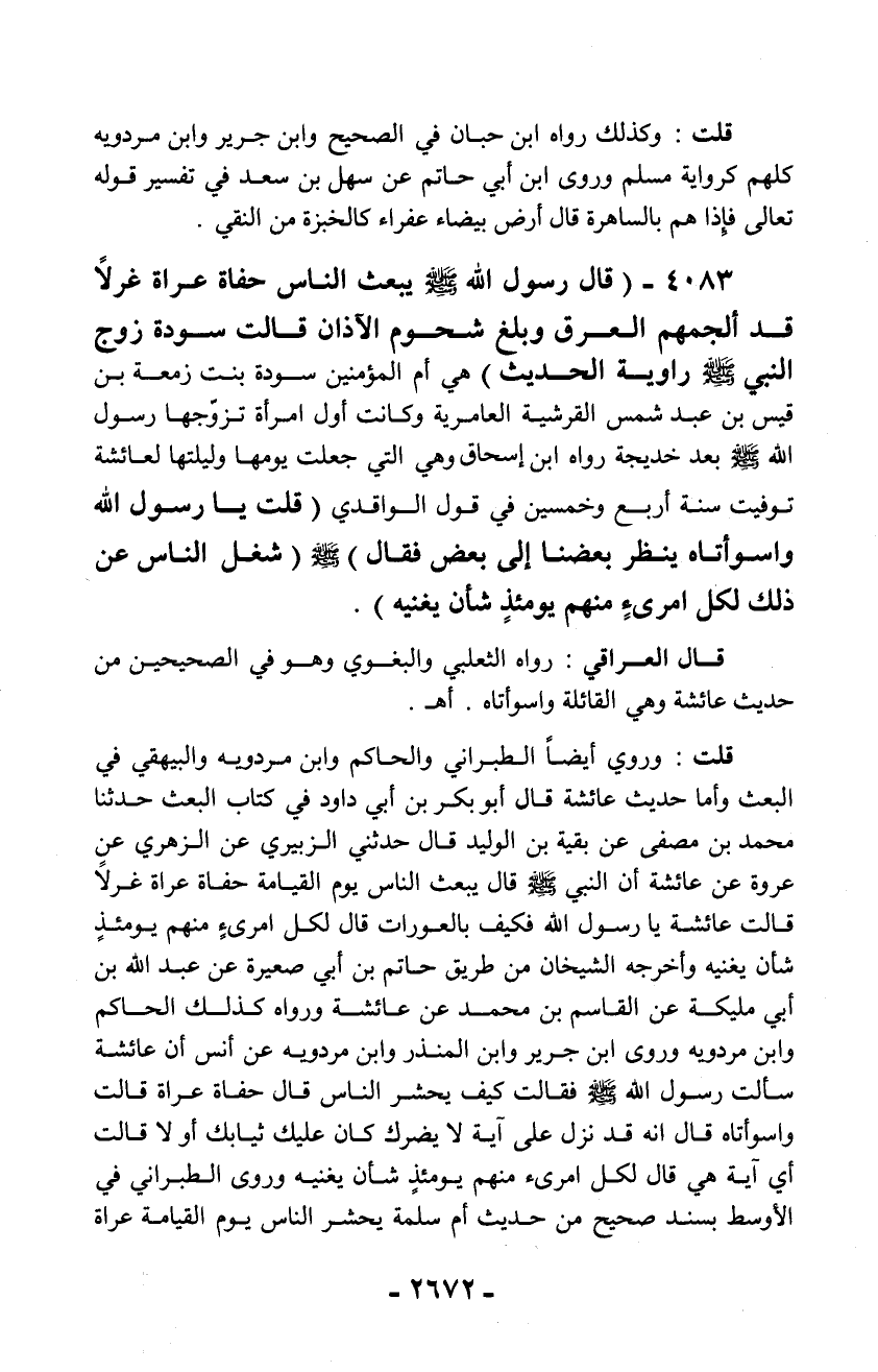 4083 - (قال رسول الله - صلّى الله عليه وسلم - يبعث الناس حفاة عراة غرلاً قد ألجمهم العرق وبلغ شحوم الأذان قالت سودة زوج النبي - صلّى الله عليه وسلم - راوية الحديث) هي أم المؤمنين سورة بنت زمعة بن قيس بن عبد شمس القرشية العامرية وكانت أول امرأة تزوّجها رسول الله - صلّى الله عليه وسلم - بعد خديجة رواه ابن إسحاق وهي التي جعلت يومها وليلتها لعائشة توفيت سنة أربع وخمسين في قول الواقدي (قلت يا رسول الله واسوأتاه ينظر بعضنا إلى بعض فقال) - صلّى الله عليه وسلم - (شغل الناس عن ذلك لكل امرئٍ منهم يومئذ شأن يغنيه).