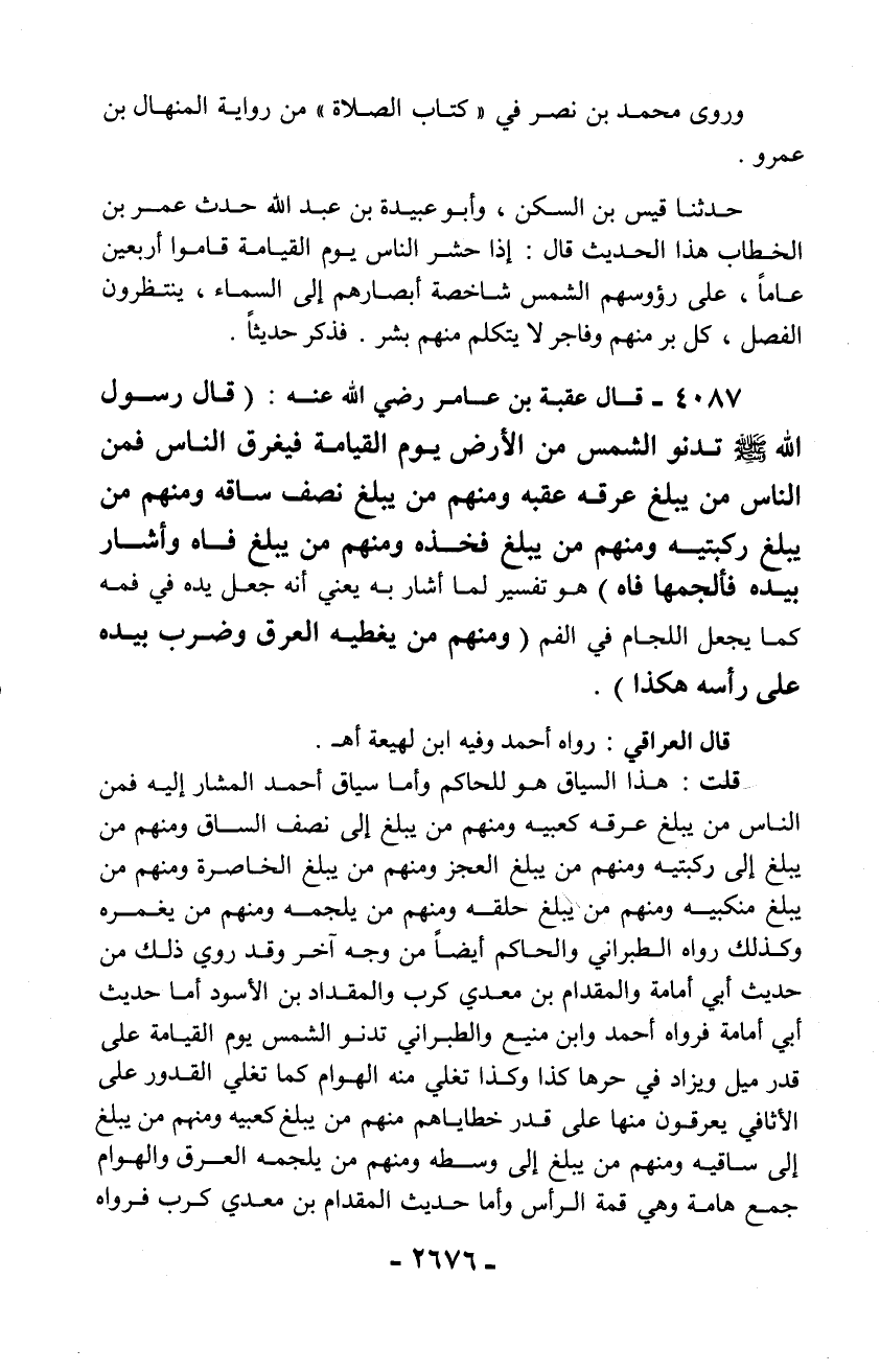 قلت: هذا السياق هو للحاكم وأما سياق أحمد المشار إليه فمن الناس من يبلغ عرقه كعبيه ومنهم من يبلغ إلى نصف الساق ومنهم من يبلغ إلى ركبتيه ومنهم من يبلغ العجز ومنهم من يبلغ الخاصرة ومنهم من يبلغ منكبيه ومنهم من يبلغ حلقه ومنهم من يلجمه ومنهم من يغمره وكذلك رواه الطبراني والحاكم أيضاً من وجه آخر وقد روي ذلك من حديث أبي أمامة والمقدام بن معدي كرب والمقداد بن الأسود أما حديث أبي أمامة فرواه أحمد وابن منيع والطبراني تدنو الشمس يوم القيامة على قدر ميل ويزاد في حرها كذا وكذا تغلي منه الهوام كما تغلي القدور على الأثافي يعرقون منها على قدر خطاياهم منهم من يبلغ كعبيه ومنهم من يبلغ إلى ساقيه ومنهم من يبلغ إلى وسطه ومنهم من يلجمه العرق والهوام جمع هامة وهي قمة الرأس وأما حديث المقدام بن معدي كرب فرواه