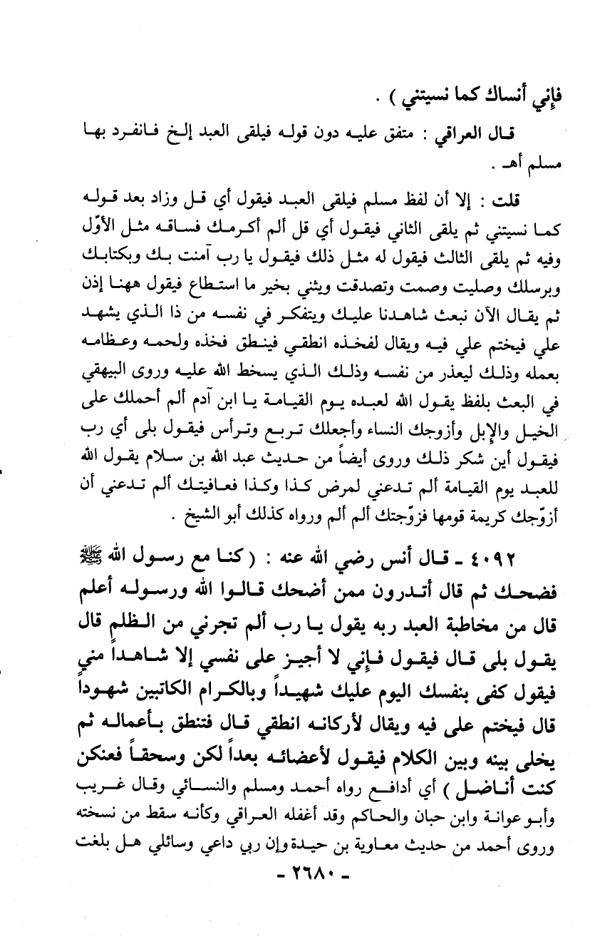 4092 - قال أنس رضي الله عنه: (كنا مع رسول الله - صلّى الله عليه وسلم - فضحك ثم قال أتدرون ممن أضحك قالوا الله ورسوله أعلم قال من مخاطبة العبد ربه يقول يا رب ألم تجرني من الظلم قال يقول بلى قال فيقول فإني لا أجيز على نفسي إلا شاهداً مني فيقول كفى بنفسك اليوم عليك شهيداً وبالكرام الكاتبين شهوداً قال فيختم على فيه ويقال لأركانه انطقي قال فتنطق بأعماله ثم يخلى بينه وبين الكلام فيقول لأعضائه بعداً لكن وسحقاً فعنكن كنت أناضل) أي أدافع رواه أحمد ومسلم والنسائي وقال غريب وأبو عوانة وابن حبان والحاكم وقد أغفله العراقي وكأنه سقط من نسخته وروى أحمد من حديث معاوية بن حيدة وإن ربي داعي وسائلي هل بلغت