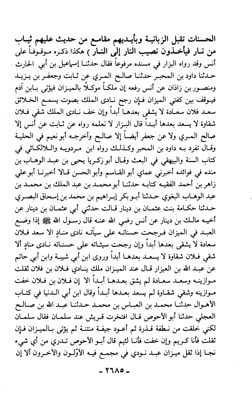 الحسنات تقبل الزبانية وبأيديهم مقامع من حديد عليهم ثياب من نار فيأخذون نصيب النار إلى النار) هكذا ذكره موقوفاً على أنس وقد رواه البزار في مسنده مرفوعاً فقال حدثنا إسماعيل بن أبي الحارث حدثنا داود بن المحبر حدثنا صالح المري عن ثابت وجعفر بن يزيد ومنصور بن زاذان عن أنس رفعه إن ملكاً موكلاً بالميزان فيؤتى بابن آدم فيوقف بين كفتي الميزان فإن رجح نادى الملك بصوت يسمع الخلائق سعد فلان سعادة لا يشقى بعدها أبداً وإن خف نادى الملك شقي فلان شقاوة لا يسعد بعدها أبداً قال البزار لا نعلمه رواه عن ثابت عن أنس إلا صالح المري ولا عن جعفر أيضاً إلا صالح وأخرجه أبو نعيم في الحلية وقال تفرد به داود بن المحبر وكذلك رواه ابن مردويه واللالكائي في كتاب السنة والبيهقي في البعث وقال أبو زكريا يحيى بن عبد الوهاب بن منده في فوائده أخبرني عماي أبو القاسم وأبو الحسن قالا أخبرنا أبو علي زاهر بن أحمد الفقيه كتابه حدثنا أبو محمد بن عبد الملك بن محمد بن عبد الوهاب البغوي حدثنا أبو بكر إبراهيم بن محمد بن إسحاق البصري حدثنا حكامة بنت عثمان بن دينار قالت حدثني أبي عثمان بن دينار عن أخيه مالك بن دينار عن أنس رضي الله عنه قال رسول الله - صلّى الله عليه وسلم - إذا وضع العبد في الميزان فرجحت حسناته على سيآته نادى مناد إلا سعد فلان سعادة لا يشقى بعدها أبداً وإن رجحت سيئاته على حسناته نادى منادٍ ألا شقي فلان شقاوة لا يسعد بعدها أبداً وروى ابن أبي شيبة وابن أبي حاتم عن عبد الله بن العيزار قال عند الميزان ملك ينادي فلان بن فلان ثقلت موازينه وسعد سعادة لم يشق بعدها أبداً إلا إن فلان بن فلان خفت موازينه وشقي شقاوة لم يسعد بعدها أبداً وقال ابن أبي الدنيا في كتاب الأهوال حدثنا محمد بن العباس بن محمد حدثنا عبد الله بن صالح العجلي حدثنا أبو الأحوص قال افتخرت قريش عند سلمان فقال سلمان لكني خلقت من نطفة قذرة ثم أعود جيفة منتنة ثم يؤتى بالميزان فإن ثقلت فأنا كريم وإن خفت فأنا لئيم قال أبو الأحوص تدري من أي شيء نجا إذا ثقل ميزان عبد نودي في مجمع فيه الأوّلون والآخرون ألا إن