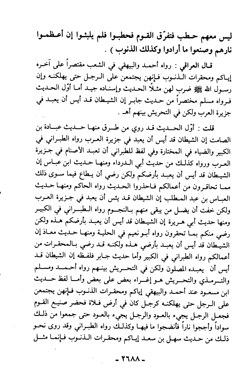 قال العراقي: رواه أحمد والبيهقي في الشعب مقتصراً على آخره إياكم ومحقرات الذنوب فإنهن يجتمعن على الرجل حتى يهلكنه وإن رسول الله - صلّى الله عليه وسلم - ضرب لهن مثلاً الحديث وإسناده جيد أما أوّل الحديث فرواه مسلم مختصراً من حديث جابر إن الشيطان قد أيس أن يعبد في جزيرة العرب ولكن في التحريش بينهم أهـ.