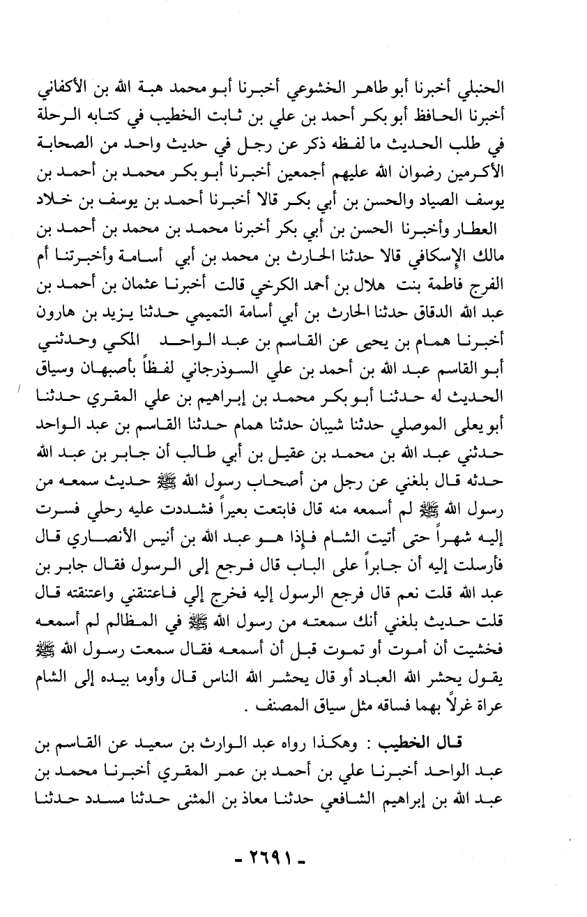 الحنبلي أخبرنا أبو طاهر الخشوعي أخبرنا أبو محمد هبة الله بن الأكفاني أخبرنا الحافظ أبو بكر أحمد بن علي بن ثابت الخطيب في كتابه الرحلة في طلب الحديث ما لفظه ذكر عن رجل في حديث واحد من الصحابة الأكرمين رضوان الله عليهم أجمعين أخبرنا أبو بكر محمد بن أحمد بن يوسف الصياد والحسن بن أبي بكر قالا أخبرنا أحمد بن يوسف بن خلاد العطار وأخبرنا الحسن بن أبي بكر أخبرنا محمد بن محمد بن أحمد بن مالك الإسكافي قالا حدثنا الحارث بن محمد بن أبي أسامة وأخبرتنا أم الفرج فاطمة بنت هلال بن أحمد الكرخي قالت أخبرنا عثمان بن أحمد بن عبد الله الدقاق حدثنا الحارث بن أبي أسامة التميمي حدثنا يزيد بن هارون أخبرنا همام بن يحيى عن القاسم بن عبد الواحد المكي وحدثني أبو القاسم عبد الله بن أحمد بن علي السوذرجاني لفظاً بأصبهان وسياق الحديث له حدثنا أبو بكر محمد بن إبراهيم بن علي المقري حدثنا أبو يعلى الموصلي حدثنا شيبان حدثنا همام حدثنا القاسم بن عبد الواحد حدثني عبد الله بن محمد بن عقيل بن أبي طالب أن جابر بن عبد الله حدثه قال بلغني عن رجل من أصحاب رسول الله - صلّى الله عليه وسلم - حديث سمعه من رسول الله - صلّى الله عليه وسلم - لم أسمعه منه قال فابتعت بعيراً فشددت عليه رحلي فسرت إليه شهراً حتى أتيت الشام فإذا هو عبد الله بن أنيس الأنصاري قال فأرسلت إليه أن جابراً على الباب قال فرجع إلى الرسول فقال جابر بن عبد الله قلت نعم قال فرجع الرسول إليه فخرج إلي فاعتنقني واعتنقته قال قلت حديث بلغني أنك سمعته من رسول الله - صلّى الله عليه وسلم - في المظالم لم أسمعه فخشيت أن أموت أو تموت قبل أن أسمعه فقال سمعت رسول الله - صلّى الله عليه وسلم - يقول يحشر الله العباد أو قال يحشر الله الناس قال وأومأ بيده إلى الشام عراة غرلاً بهما فساقه مثل سياق المصنف.