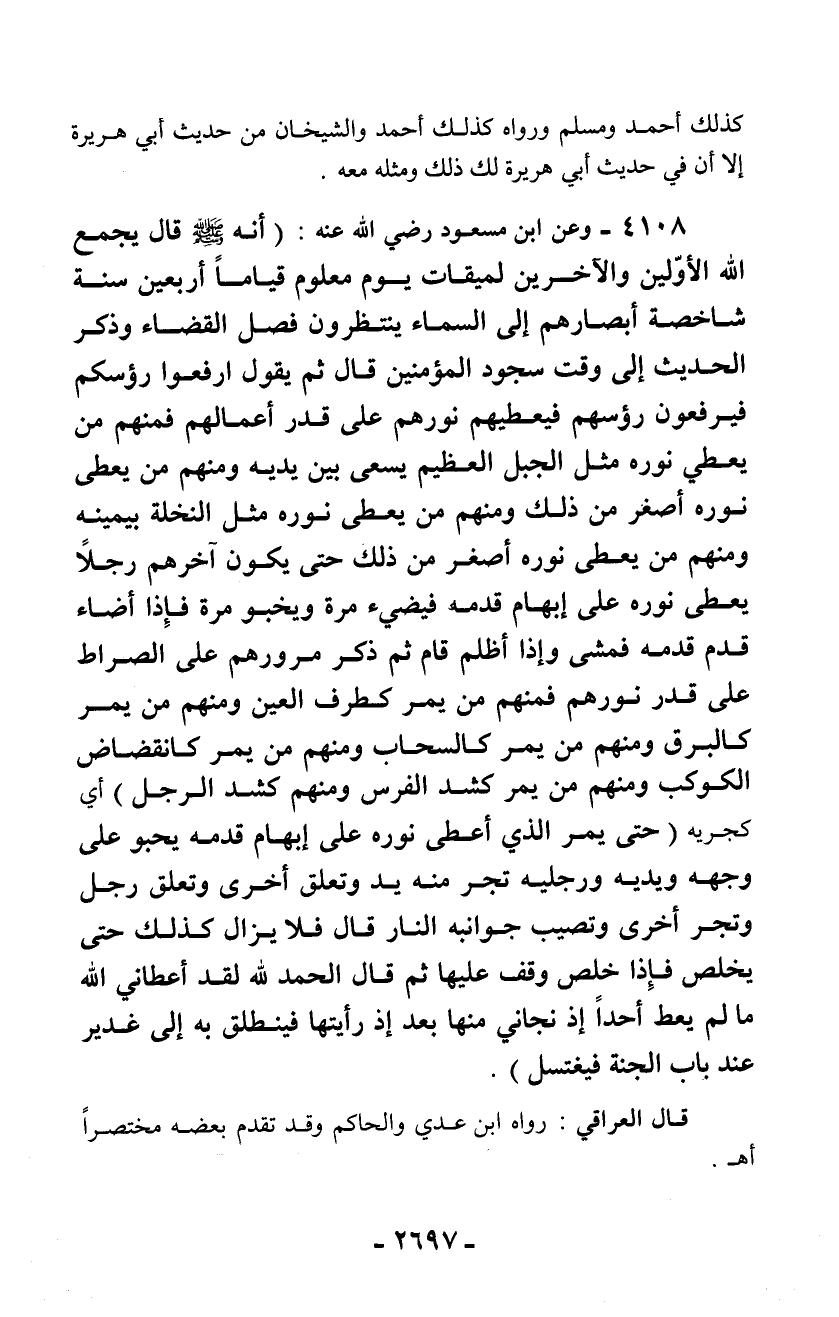 4108 - وعن ابن مسعود رضي الله عنه: (أنه - صلّى الله عليه وسلم - قال يجمع الله الأوّلين والآخرين لميقات يوم معلوم قياماً أربعين سنة شاخصة أبصارهم إلى السماء ينتظرون فصل القضاء وذكر الحديث إلى وقت سجود المؤمنين قال ثم يقول ارفعوا رؤسكم فيرفعون رؤسهم فيعطيهم نورهم على قدر أعمالهم فمنهم من يعطي نوره مثل الجبل العظيم يسعى بين يديه ومنهم من يعطى نوره أصغر من ذلك ومنهم من يعطى نوره مثل النخلة بيمينه ومنهم من يعطى نوره أصغر من ذلك حتى يكون آخرهم رجلاً يعطى نوره على إبهام قدمه فيضيء مرة ويخبو مرة فإذا أضاء قدم قدمه فمشى وإذا أظلم قام ثم ذكر مرورهم على الصراط على قدر نورهم فمنهم من يمر كطرف العين ومنهم من يمر كالبرق ومنهم من يمر كالسحاب ومنهم من يمر كانقضاض الكوكب ومنهم من يمر كشد الفرس ومنهم كشد الرجل) أي كجريه (حتى يمر الذي أعطى نوره على إبهام قدمه يحبو على وجهه ويديه ورجليه تجر منه يد وتعلق أخرى وتعلق رجل وتجر أخرى وتصيب جوانبه النار قال فلا يزال كذلك حتى يخلص فإذا خلص وقف عليها ثم قال الحمد لله لقد أعطاني الله ما لم يعط أحداً إذ نجاني منها بعد إذ رأيتها فينطلق به إلى غدير عند باب الجنة فيغتسل).