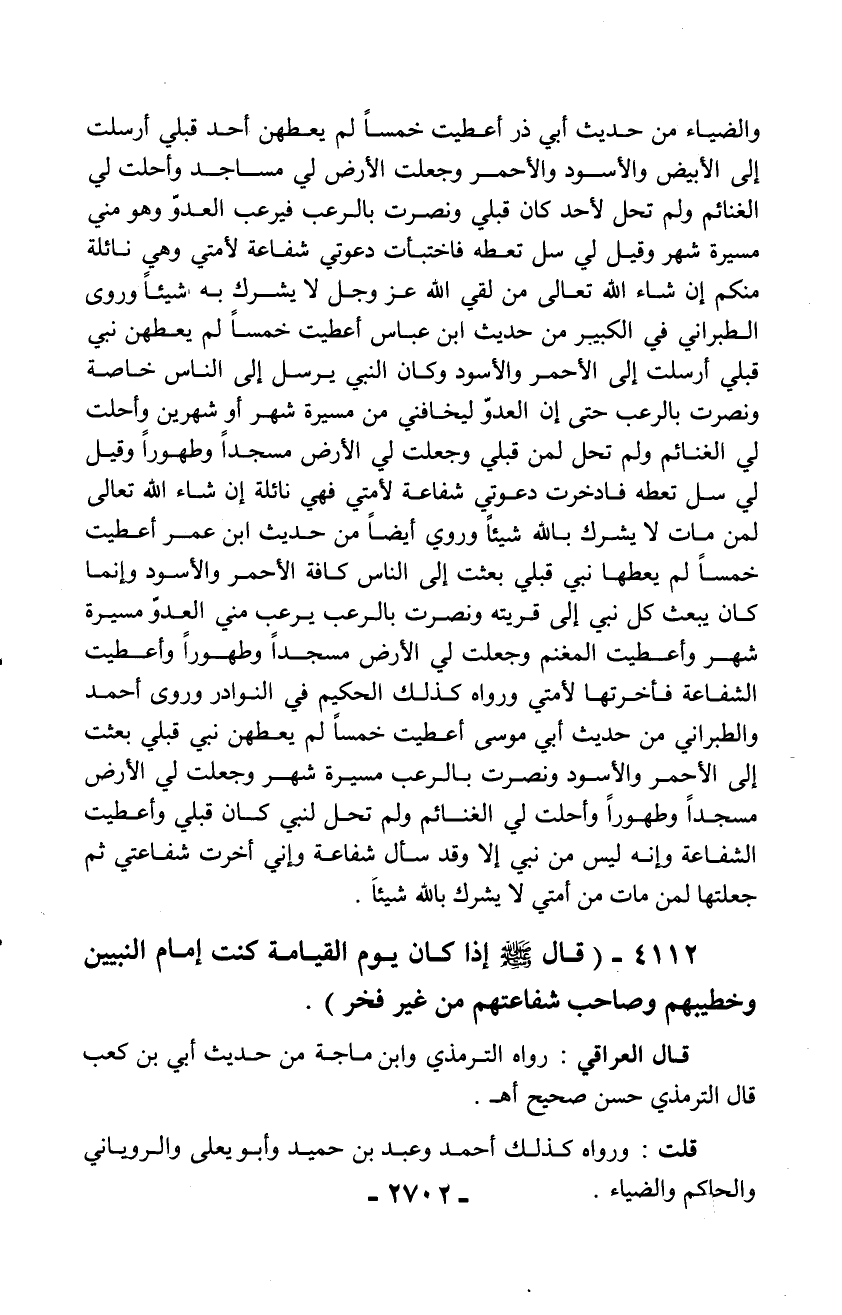 4112 - (قال - صلّى الله عليه وسلم - إذا كان يوم القيامة كنت إمام النبيين وخطيبهم وصاحب شفاعتهم من غير فخر).
