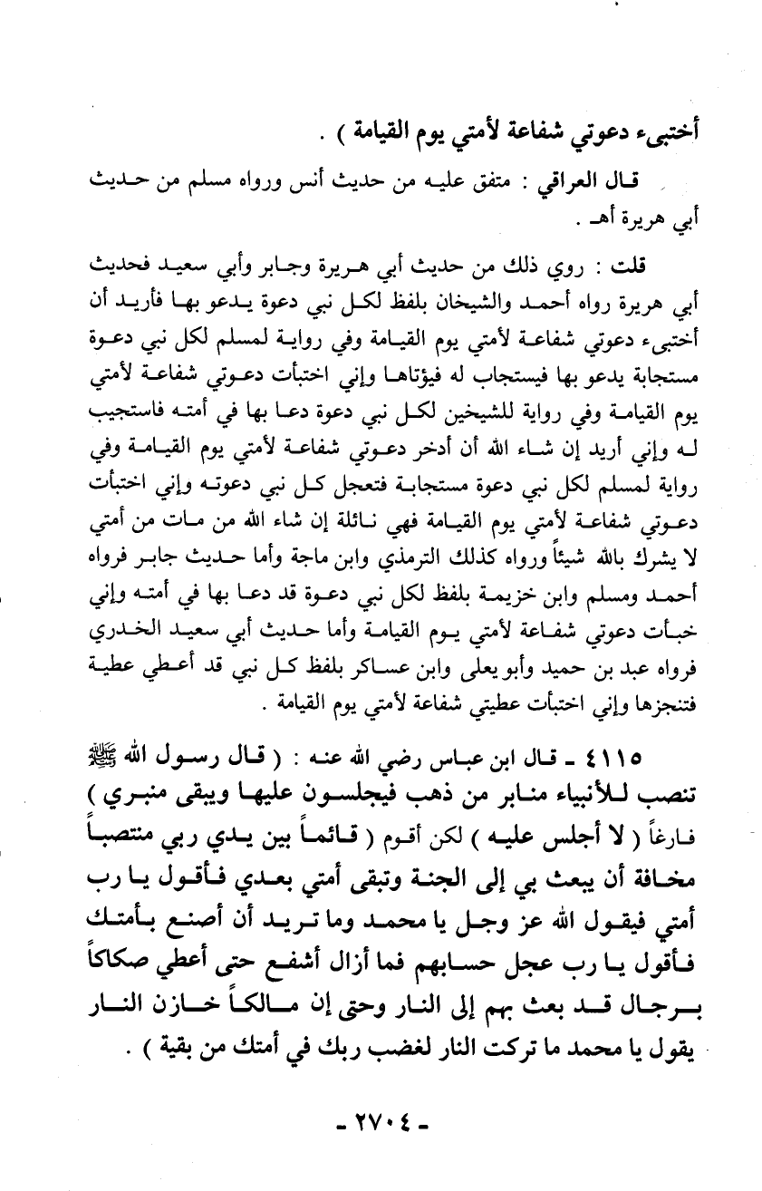 4115 - قال ابن عباس رضي الله عنه: (قال رسول الله - صلّى الله عليه وسلم - تنصب للأنبياء منابر من ذهب فيجلسون عليها ويبقى منبري) فارغاً (لا أجلس عليه) لكن أقوم (قائماً بين يدي ربي منتصباً مخافة أن يبعث بي إلى الجنة وتبقى أمتي بعدي فأقول يا رب أمتي فيقول الله عز وجل يا محمد وما تريد أن أصنع بأمتك فأقول يا رب عجل حسابهم فما أزال أشفع حتى أعطي صكاكاً برجال قد بعث بهم إلى النار وحتى إن مالكاً خازن النار يقول يا محمد ما تركت النار لغضب ربك في أمتك من بقية).