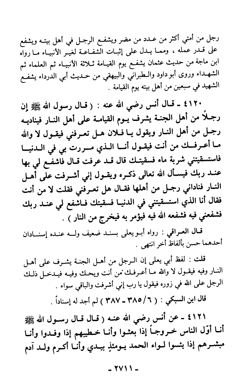 4120 - قال أنس رضي الله عنه: (قال رسول الله - صلّى الله عليه وسلم - إن رجلاً من أهل الجنة يشرف يوم القيامة على أهل النار فيناديه رجل من أهل النار ويقول يا فلان هل تعرفني فيقول لا والله ما أعرفك من أنت فيقول أنا الذي مررت بي في الدنيا فاستسقيتني شربة ماء فسقيتك قال قد عرفت قال فاشفع لي بها عند ربك فيسأل الله تعالى ذكره ويقول إني أشرفت على أهل النار فناداني رجل من أهلها فقال هل تعرفني فقلت لا من أنت فقال أنا الذي استسقيتني في الدنيا فسقيتك فاشفع لي عند ربك فشفعني فيه فشفعه الله فيه فيؤمر به فيخرج من النار).