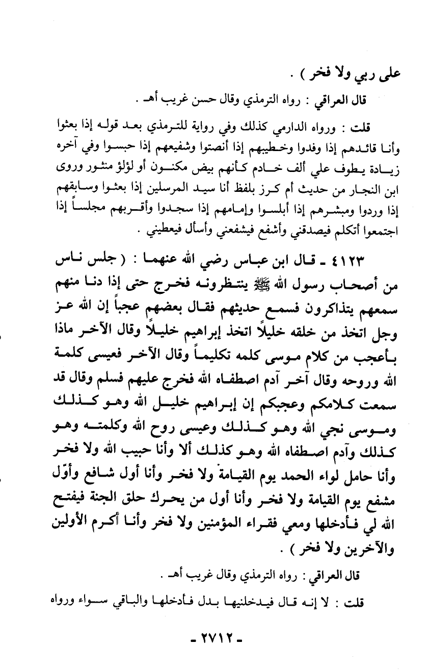4123 - قال ابن عباس رضي الله عنهما: (جلس ناس من أصحاب رسول الله - صلّى الله عليه وسلم - ينتظرونه فخرج حتى إذا دنا منهم سمعهم يتذاكرون فسمع حديثهم فقال بعضهم عجباً إن الله عز وجل اتخذ من خلقه خليلاً اتخذ إبراهيم خليلاً وقال الآخر ماذا بأعجب من كلام موسى كلمه تكليماً وقال الآخر فعيسى كلمة الله وروحه وقال آخر آدم اصطفاه الله فخرج عليهم فسلم وقال قد سمعت كلامكم وعجبكم إن إبراهيم خليل الله وهو كذلك وموسى نجي الله وهو كذلك وعيسى روح الله وكلمته وهو كذلك وآدم اصطفاه الله وهو كذلك ألا وأنا حبيب الله ولا فخر وأنا حامل لواء الحمد يوم القيامة ولا فخر وأنا أول شافع وأوّل مشفع يوم القيامة ولا فخر وأنا أول من يحرك حلق الجنة فيفتح الله لي فأدخلها ومعي فقراء المؤمنين ولا فخر وأنا أكرم الأولين والآخرين ولا فخر).