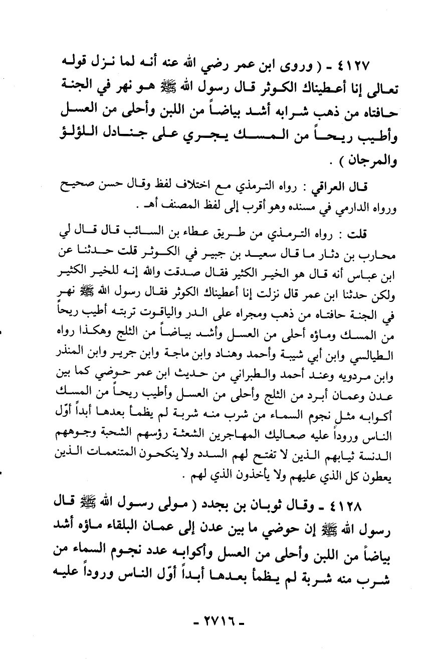 4127 - (وروى ابن عمر رضي الله عنه أنه لما نزل قوله تعالى إنا أعطيناك الكوثر قال رسول الله - صلّى الله عليه وسلم - هو نهر في الجنة حافتاه من ذهب شرابه أشد بياضاً من اللبن وأحلى من العسل وأطيب ريحاً من المسك يجري على جنادل اللؤلؤ والمرجان).