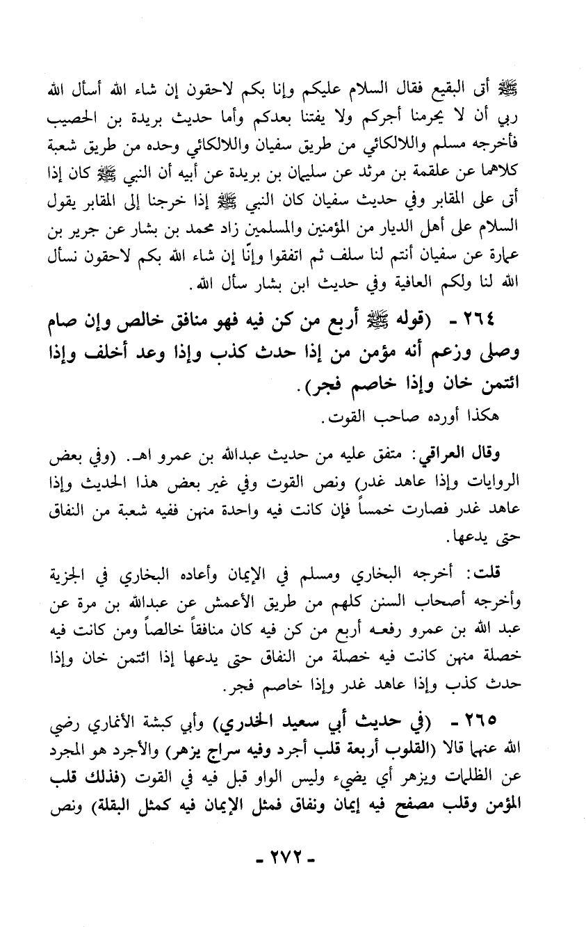264 - (قوله - صلى الله عليه وسلم - أربع من كن فيه فهو منافق خالص وإن صام وصلى وزعم أنه مؤمن من إذا حدث كذب وإذا وعد أخلف وإذا ائتمن خان وإذا خاصم فجر).