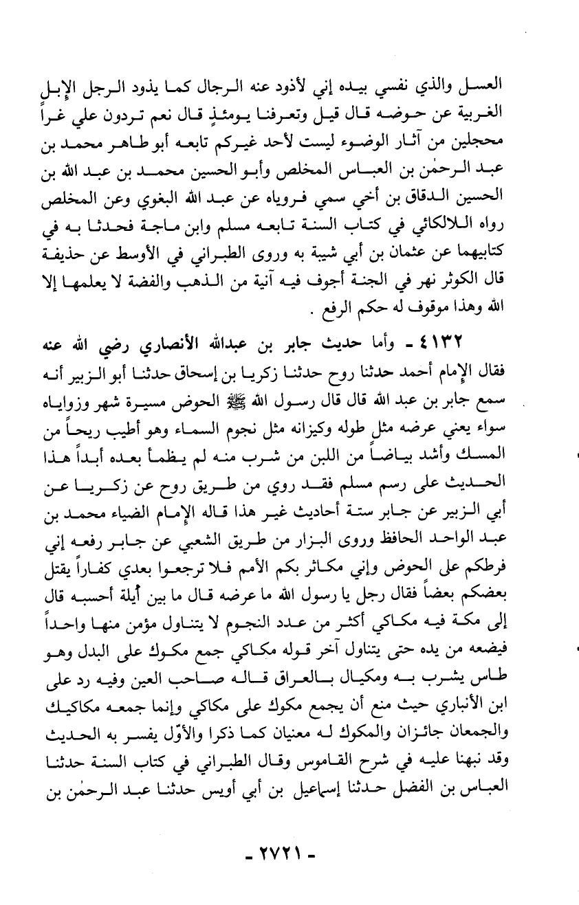 4132 - وأما حديث جابر بن عبد الله الأنصاري رضي الله عنه فقال الإمام أحمد حدثنا روح حدثنا زكريا بن إسحاق حدثنا أبو الزبير أنه سمع جابر بن عبد الله قال قال رسول الله - صلّى الله عليه وسلم - الحوض مسيرة شهر وزواياه سواء يعني عرضه مثل طوله وكيزانه مثل نجوم السماء وهو أطيب ريحاً من المسك وأشد بياضاً من اللبن من شرب منه لم يظمأ بعده أبداً هذا الحديث على رسم مسلم فقد روي من طريق روح عن زكريا عن أبي الزبير عن جابر ستة أحاديث غير هذا قاله الإمام الضياء محمد بن عبد الواحد الحافظ وروى البزار من طريق الشعبي عن جابر رفعه إني فرطكم على الحوض وإني مكاثر بكم الأمم فلا ترجعوا بعدي كفاراً يقتل بعضكم بعضاً فقال رجل يا رسول الله ما عرضه قال ما بين أيلة أحسبه قال إلى مكة فيه مكاكي أكثر من عدد النجوم لا يتناول مؤمن منها واحداً فيضعه من يده حتى يتناول آخر قوله مكاكي جمع مكوك على البدل وهو طاس يشرب به ومكيال بالعراق قاله صاحب العين وفيه رد على ابن الأنباري حيث منع أن يجمع مكوك على مكاكي وإنما جمعه مكاكيك والجمعان جائزان والمكوك له معنيان كما ذكرا والأوّل يفسر به الحديث وقد نبهنا عليه في شرح القاموس وقال الطبراني في كتاب السنة حدثنا العباس بن الفضل حدثنا إسماعيل بن أبي أويس حدثنا عبد الرحمن بن