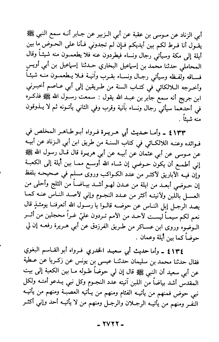 4133 - وأما حديث أبي هريرة فرواه أبو طاهر المخلص في فوائده وعنه اللالكائي في كتاب السنة من طريق ابن أبي الزناد عن أبيه عن موسى عن أبي عثمان عن أبيه عن أبي هريرة قال قال رسول الله - صلّى الله عليه وسلم - إني أطمع أن يكون حوضي إن شاء الله أوسع مما بين أيلة إلى الكعبة وإن فيه الأباريق لأكثر من عدد الكواكب وروى مسلم في صحيحه بلفظ إن حوضي أبعد من أيلة من عدن لهو أشد بياضاً من الثلج وأحلى من العسل باللبن ولآنيته أكثر من عدد النجوم وإني لأصد الناس عنه كما يصد الرجل إبل الناس عن حوضه قالوا يا رسول الله أتعرفنا يومئذ قال نعم لكم سيماً ليست لأحد من الأمم تردون علىّ غراً محجلين من أثر الوضوء وروى ابن عساكر من طريق الفرزدق عن أبي هريرة رفعه إن لي حوضاً كما بين أيلة وعمان.