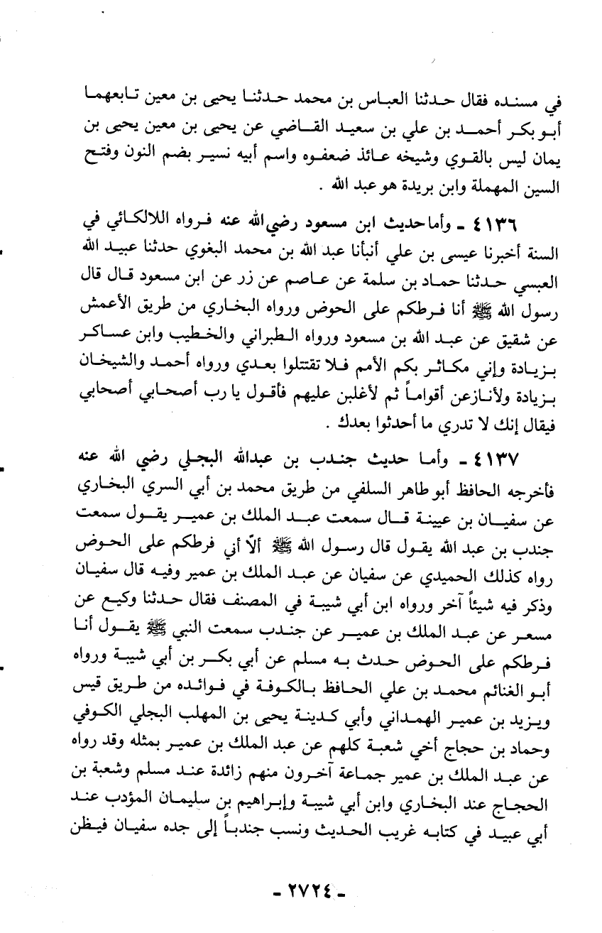 4136 - وأما حديث ابن مسعود رضي الله عنه فرواه اللالكائي في السنة أخبرنا عيسى بن علي أنبأنا عبد الله بن محمد البغوي حدثنا عبيد الله العبسي حدثنا حماد بن سلمة عن عاصم عن زر عن ابن مسعود قال قال رسول الله - صلّى الله عليه وسلم - أنا فرطكم على الحوض ورواه البخاري من طريق الأعمش عن شقيق عن عبد الله بن مسعود ورواه الطبراني والخطيب وابن عساكر بزيادة وإني مكاثر بكم الأمم فلا تقتتلوا بعدي ورواه أحمد والشيخان بزيادة ولأنازعن أقواماً ثم لأغلبن عليهم فأقول يا رب أصحابي أصحابي فيقال إنك لا تدري ما أحدثوا بعدك.