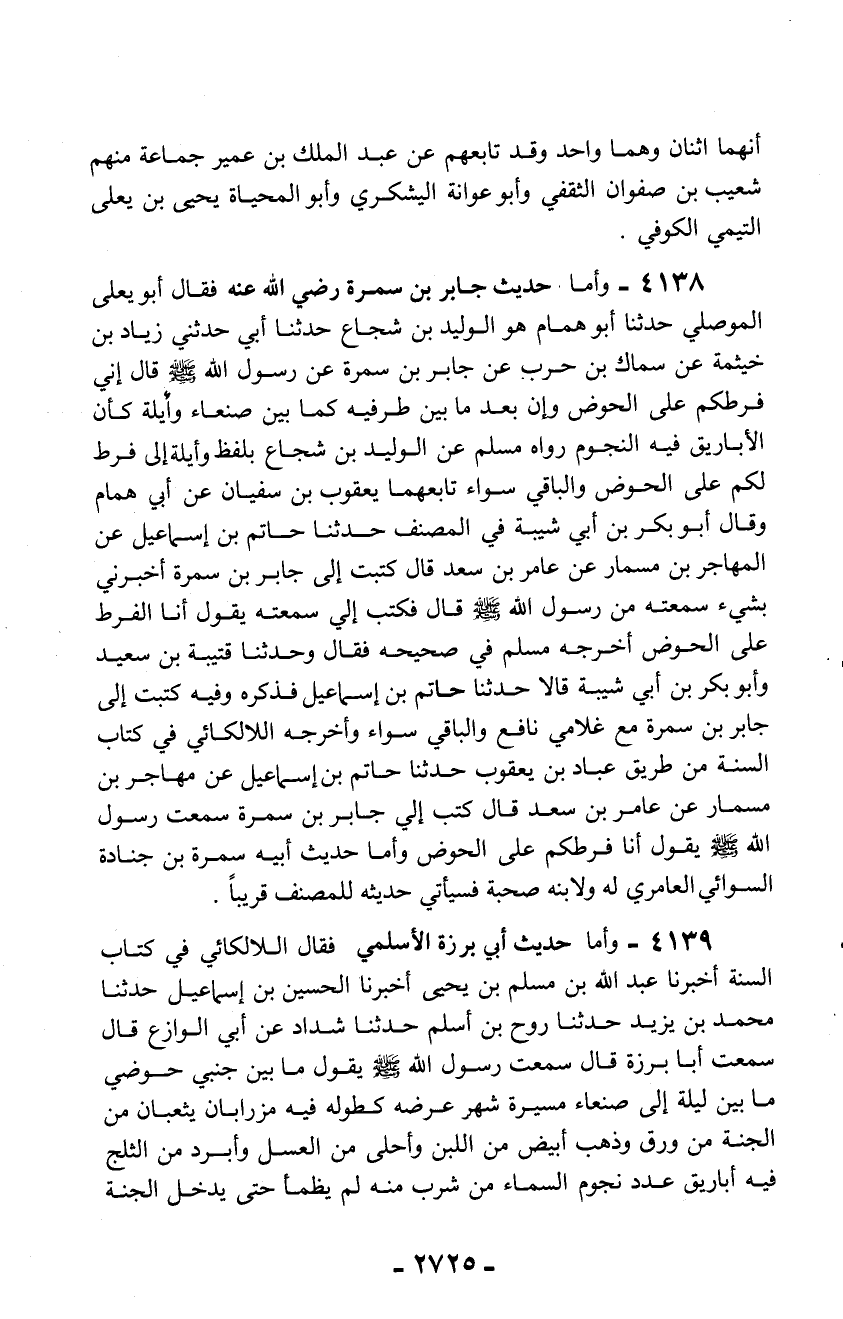 4139 - وأما حديث أبي برزة الأسلمي فقال اللالكائي في كتاب السنة أخبرنا عبد الله بن مسلم بن يحيى أخبرنا الحسين بن إسماعيل حدثنا محمد بن يزيد حدثنا روح بن أسلم حدثنا شداد عن أبي الوازع قال سمعت أبا برزة قال سمعت رسول الله - صلّى الله عليه وسلم - يقول ما بين جنبي حوضي ما بين ليلة إلى صنعاء مسيرة شهر عرضه كطوله فيه مزرابان يثعبان من الجنة من ورق وذهب أبيض من اللبن وأحلى من العسل وأبرد من الثلج فيه أباريق عدد نجوم السماء من شرب منه لم يظمأ حتى يدخل الجنة