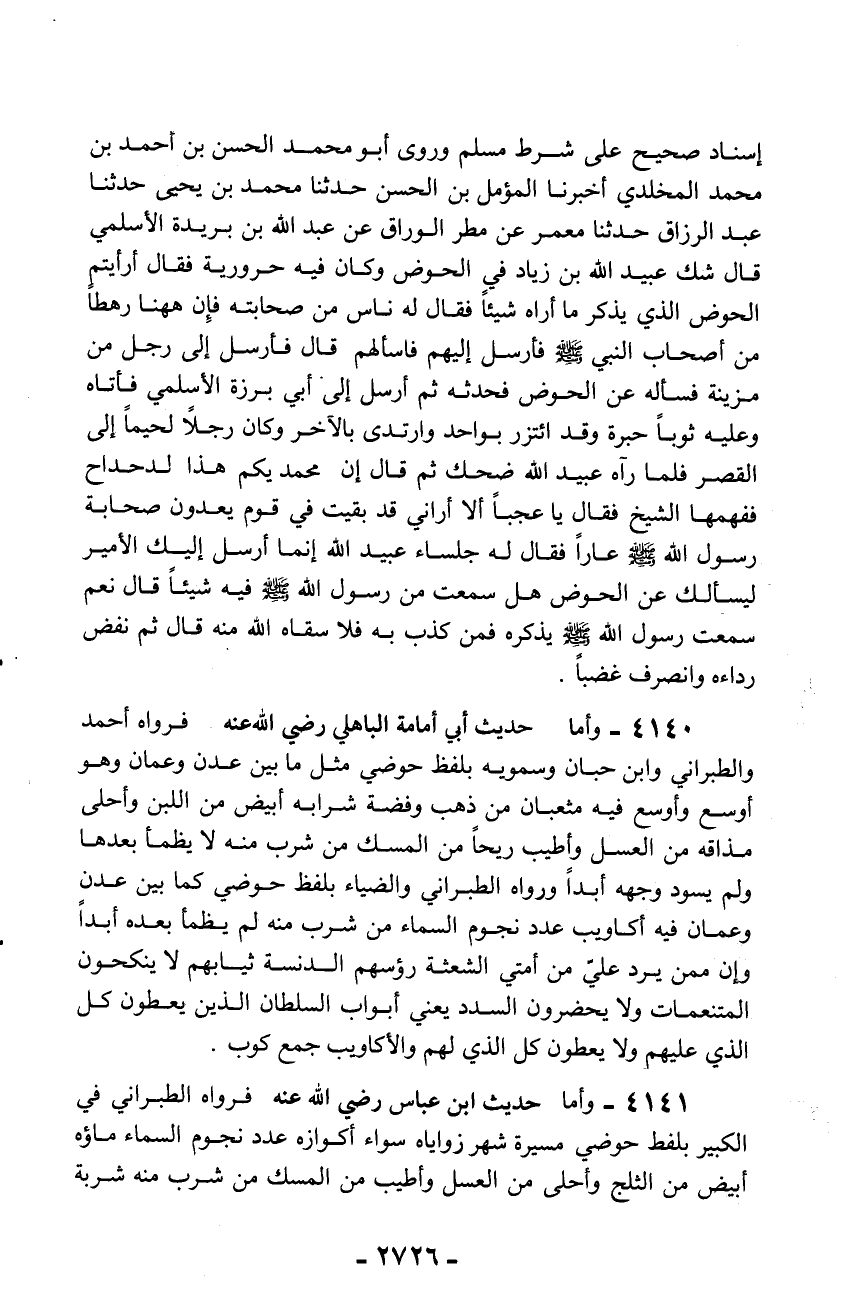 4140 - وأما حديث أبي أمامة الباهلي رضي الله عنه فرواه أحمد والطبراني وابن حبان وسمويه بلفظ حوضي مثل ما بين عدن وعمان وهو أوسع وأوسع فيه مثعبان من ذهب وفضة شرابه أبيض من اللبن وأحلى مذاقه من العسل وأطيب ريحاً من المسك من شرب منه لا يظمأ بعدها ولم يسود وجهه أبداً ورواه الطبراني والضياء بلفظ حوضي كما بين عدن وعمان فيه أكاويب عدد نجوم السماء من شرب منه لم يظمأ بعده أبداً وإن ممن يرد علىّ من أمتي الشعثة رؤسهم الدنسة ثيابهم لا ينكحون المتنعمات ولا يحضرون السدد يعني أبواب السلطان الذين يعطون كل الذي عليهم ولا يعطون كل الذي لهم والأكاويب جمع كوب.