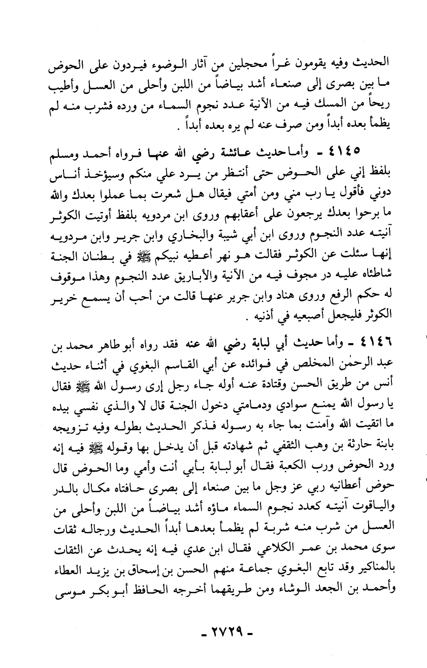4145 - وأما حديث عائشة رضي الله عنها فرواه أحمد ومسلم بلفظ إني على الحوض حتى أنتظر من يرد علي منكم وسيؤخذ أناس دوني فأقول يا رب مني ومن أمتي فيقال هل شعرت بما عملوا بعدك والله ما برحوا بعدك يرجعون على أعقابهم وروى ابن مردويه بلفظ أوتيت الكوثر آنيته عدد النجوم وروى ابن أبي شيبة والبخاري وابن جرير وابن مردويه إنها سئلت عن الكوثر فقالت هو نهر أعطيه نبيكم - صلّى الله عليه وسلم - في بطنان الجنة شاطئاه عليه در مجوف فيه من الأنية والأباريق عدد النجوم وهذا موقوف له حكم الرفع وروى هناد وابن جرير عنها قالت من أحب أن يسمع خرير الكوثر فليجعل أصبعيه في أذنيه.