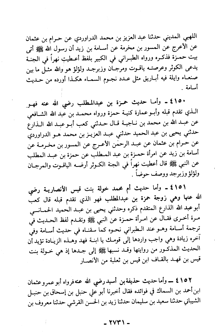 4150 - وأما حديث حمزة بن عبد المطلب رضي الله عنه فهو الذي تقدم قبله وأبو عمارة كنية حمزة ورواه محمد بن عبد الله الشافعي عن عبد الله بن محمد بن ناجية قال حدثني كعب أبو عبد الله الذارع حدثني يحيى بن عبد الحميد حدثني عبد العزيز بن محمد هو الدراوردي عن حرام بن عثمان عن عبد الرحمن الأعرج عن المسور بن مخرمة عن أسامة بن زيد عن امرأة حمزة بن عبد المطلب عن حمزة بن عبد المطلب عن النبي - صلّى الله عليه وسلم - قال أعطيت نهراً في الجنة الكوثر أرضه الياقوت والمرجان ولؤلؤ وزبرجد ووصف حوضاً.