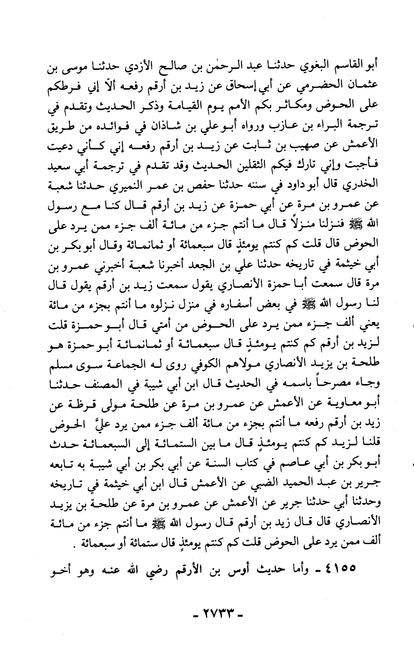 أبو القاسم البغوي حدثنا عبد الرحمن بن صالح الأزدي حدثنا موسى بن عثمان الحضرمي عن أبي إسحاق عن زيد بن أرقم رفعه ألا إني فرطكم على الحوض ومكاثر بكم الأمم يوم القيامة وذكر الحديث وتقدم في ترجمة البراء بن عازب ورواه أبو علي بن شاذان في فوائده من طريق الأعمش عن صهيب بن ثابت عن زيد بن أرقم رفعه إني كأني دعيت فأجبت وإني تارك فيكم الثقلين الحديث وقد تقدم في ترجمة أبي سعيد الخدري قال أبو داود في سننه حدثنا حفص بن عمر النميري حدثنا شعبة عن عمرو بن مرة عن أبي حمزة عن زيد بن أرقم قال كنا مع رسول الله - صلّى الله عليه وسلم - فنزلنا منزلاً قال ما أنتم جزء من مائة ألف جزء ممن يرد على الحوض قال قلت كم كنتم يومئذ قال سبعمائة أو ثمانمائة وقال أبو بكر بن أبي خيثمة في تاريخه حدثنا علي بن الجعد أخبرنا شعبة أخبرني عمرو بن مرة قال سمعت أبا حمزة الأنصاري يقول سمعت زيد بن أرقم يقول قال لنا رسول الله - صلّى الله عليه وسلم - في بعض أسفاره في منزل نزلوه ما أنتم بجزء من مائة يعني ألف جزء ممن يرد على الحوض من أمتي قال أبو حمزة قلت لزيد بن أرقم كم كنتم يومئذ قال سبعمائة أو ثمانمائة أبو حمزة هو طلحة بن يزيد الأنصاري مولاهم الكوفي روى له الجماعة سوى مسلم وجاء مصرحاً باسمه في الحديث قال ابن أبي شيبة في المصنف حدثنا أبو معاوية عن الأعمش عن عمرو بن مرة عن طلحة مولى قرظة عن زيد بن أرقم رفعه ما أنتم بجزء من مائة ألف جزء ممن يرد عليّ الحوض قلنا لزيد كم كنتم يومئذ قال ما بين الستمائة إلى السبعمائة حدث أبو بكر بن أبي عاصم في كتاب السنة عن أبي بكر بن أبي شيبة به تابعه جرير بن عبد الحميد الضبي عن الأعمش قال ابن أبي خيثمة في تاريخه وحدثنا أبي حدثنا جرير عن الأعمش عن عمرو بن مرة عن طلحة بن يزيد الأنصاري قال قال زيد بن أرقم قال رسول الله - صلّى الله عليه وسلم - ما أنتم جزء من مائة ألف ممن يرد على الحوض قلت كم كنتم يومئذ قال ستمائة أو سبعمائة.
