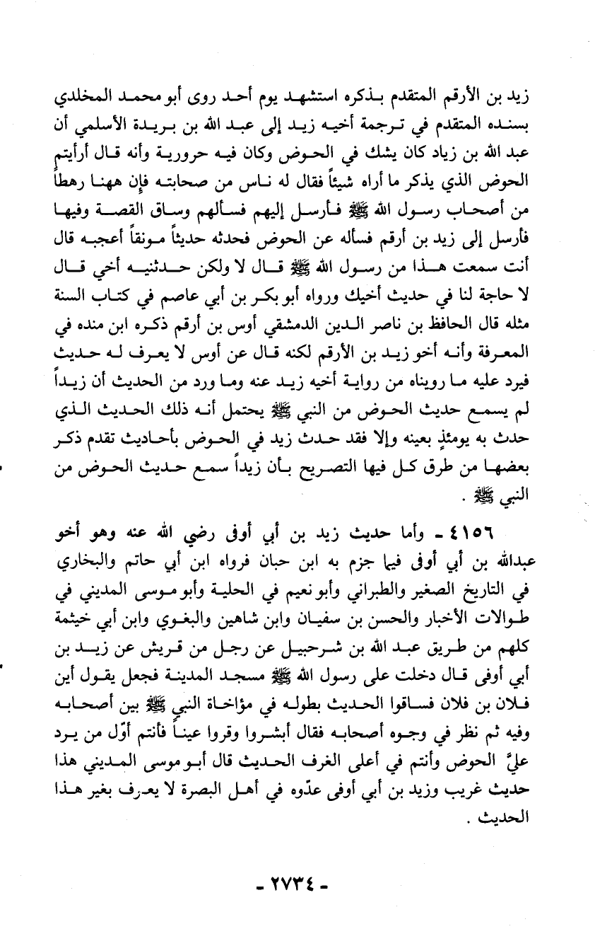 4156 - وأما حديث زيد بن أبي أوفى رضي الله عنه وهو أخو عبد الله بن أبي أوفى فيما جزم به ابن حبان فرواه ابن أبي حاتم والبخاري في التاريخ الصغير والطبراني وأبو نعيم في الحلية وأبو موسى المديني في طوالات الأخبار والحسن بن سفيان وابن شاهين والبغوي وابن أبي خيثمة كلهم من طريق عبد الله بن شرحبيل عن رجل من قريش عن زيد بن أبي أوفى قال دخلت على رسول الله - صلّى الله عليه وسلم - مسجد المدينة فجعل يقول أين فلان بن فلان فساقوا الحديث بطوله في مؤاخاة النبى - صلّى الله عليه وسلم - بين أصحابه وفيه ثم نظر في وجوه أصحابه فقال أبشروا وقروا عيناً فأنتم أوّل من يرد عليّ الحوض وأنتم في أعلى الغرف الحديث قال أبو موسى المديني هذا حديث غريب وزيد بن أبي أوفى عدّوه في أهل البصرة لا يعرف بغير هذا الحديث.