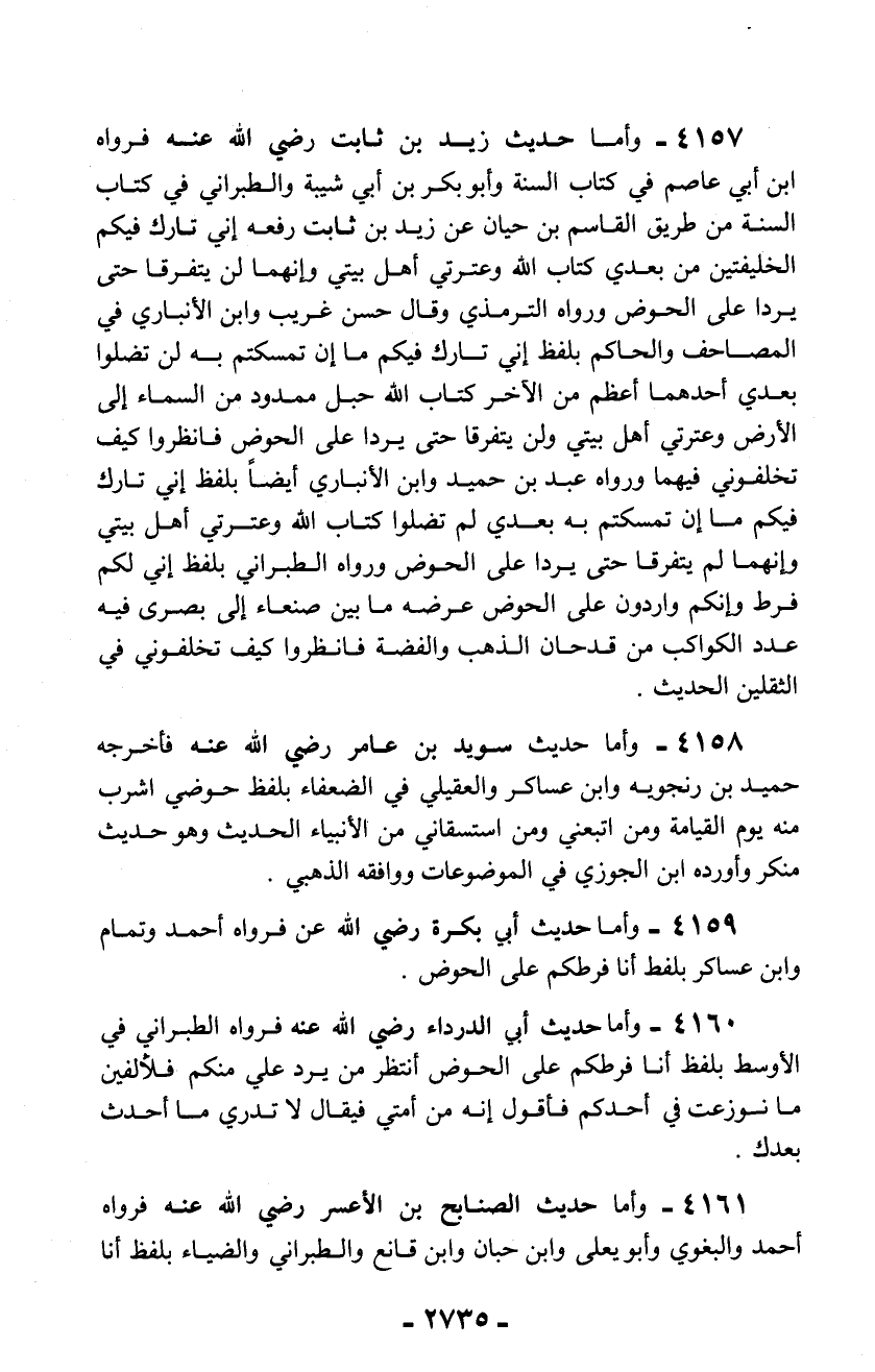 4157 - وأما حديث زيد بن ثابت رضي الله عنه فرواه ابن أبي عاصم في كتاب السنة وأبو بكر بن أبي شيبة والطبراني في كتاب السنة من طريق القاسم بن حيان عن زيد بن ثابت رفعه إني تارك فيكم الخليفتين من بعدي كتاب الله وعترتي أهل بيتي وإنهما لن يتفرقا حتى يردا على الحوض ورواه الترمذي وقال حسن غريب وابن الأنباري في المصاحف والحاكم بلفظ إني تارك فيكم ما إن تمسكتم به لن تضلوا بعدي أحدهما أعظم من الآخر كتاب الله حبل ممدود من السماء إلى الأرض وعترتي أهل بيتي ولن يتفرقا حتى يردا على الحوض فانظروا كيف تخلفوني فيهما ورواه عبد بن حميد وابن الأنباري أيضاً بلفظ إني تارك فيكم ما إن تمسكتم به بعدي لم تضلوا كتاب الله وعترتي أهل بيتي وإنهما لم يتفرقا حتى يردا على الحوض ورواه الطبراني بلفظ إني لكم فرط وإنكم واردون على الحوض عرضه ما بين صنعاء إلى بصرى فيه عدد الكواكب من قدحان الذهب والفضة فانظروا كيف تخلفوني في الثقلين الحديث.