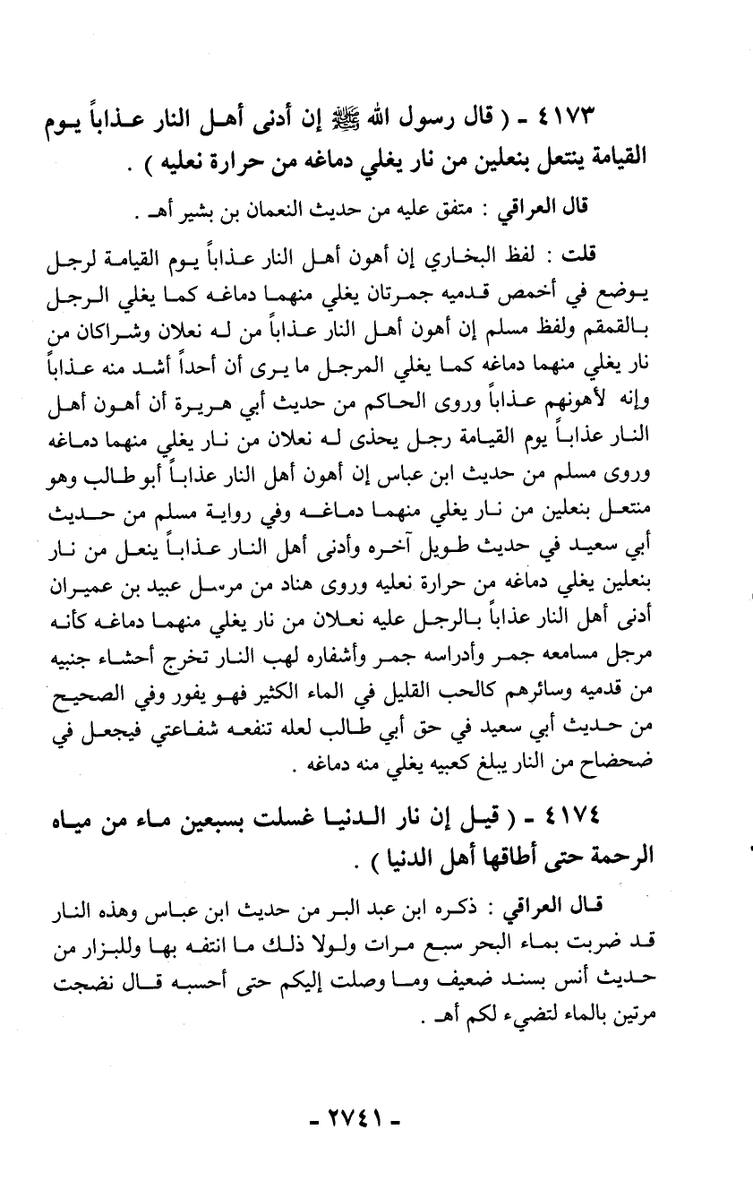 4173 - (قال رسول الله - صلّى الله عليه وسلم - إن أدنى أهل النار عذاباً يوم القيامة ينتعل بنعلين من نار يغلي دماغه من حرارة نعليه).