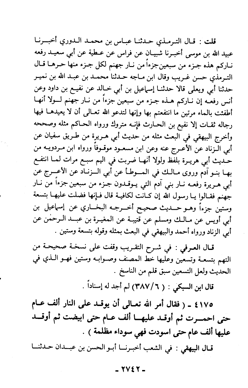 4175 - (فقال أمر الله تعالى أن يوقد على النار ألف عام حتى احمرت ثم أوقد عليها ألف عام حتى ابيضت ثم أوقد عليها ألف عام حتى اسودت فهي سوداء مظلمة).