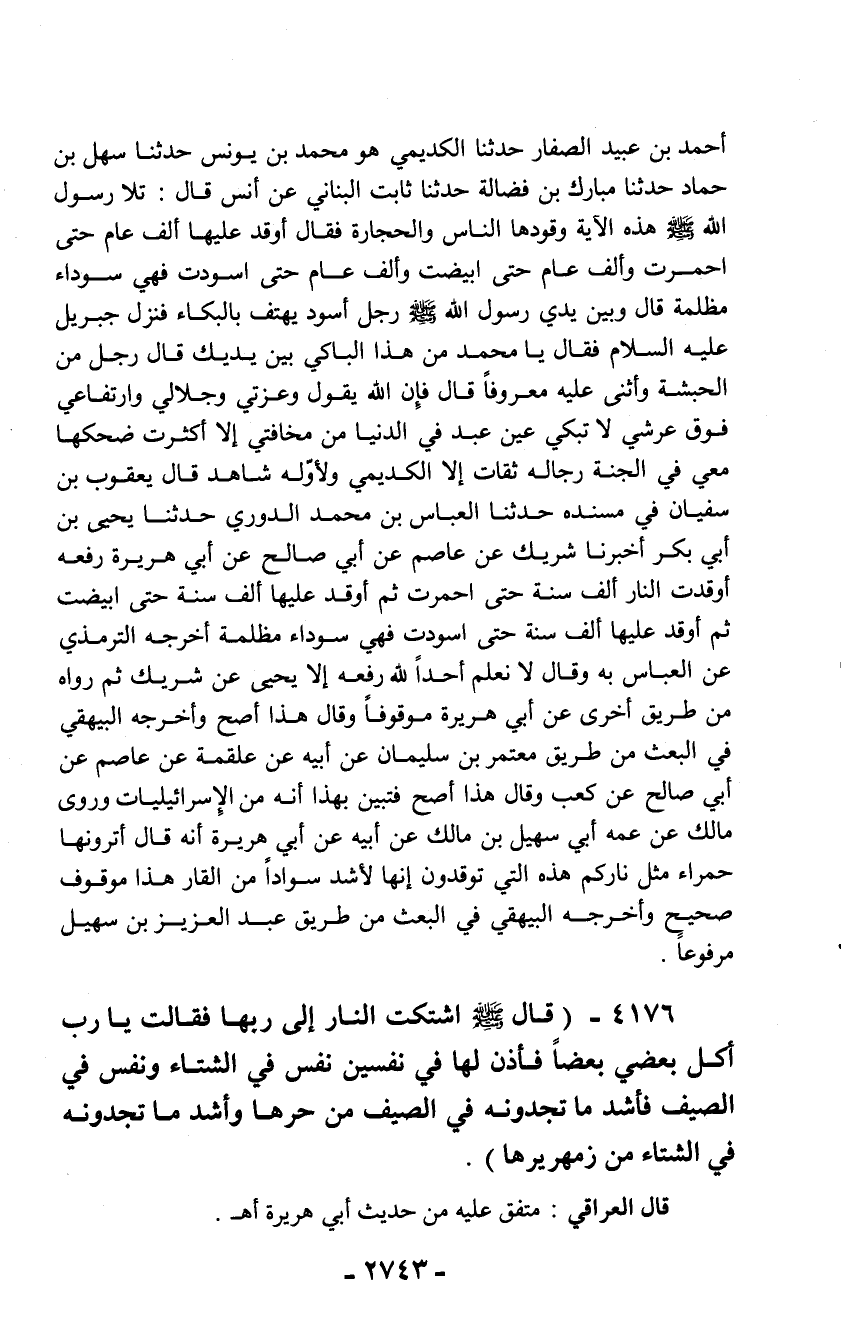 4176 - (قال - صلّى الله عليه وسلم - اشتكت النار إلى ربها فقالت يا رب أكل بعضي بعضاً فأذن لها في نفسين نفس في الشتاء ونفس في الصيف فأشد ما تجدونه في الصيف من حرها وأشد ما تجدونه في الشتاء من زمهريرها).