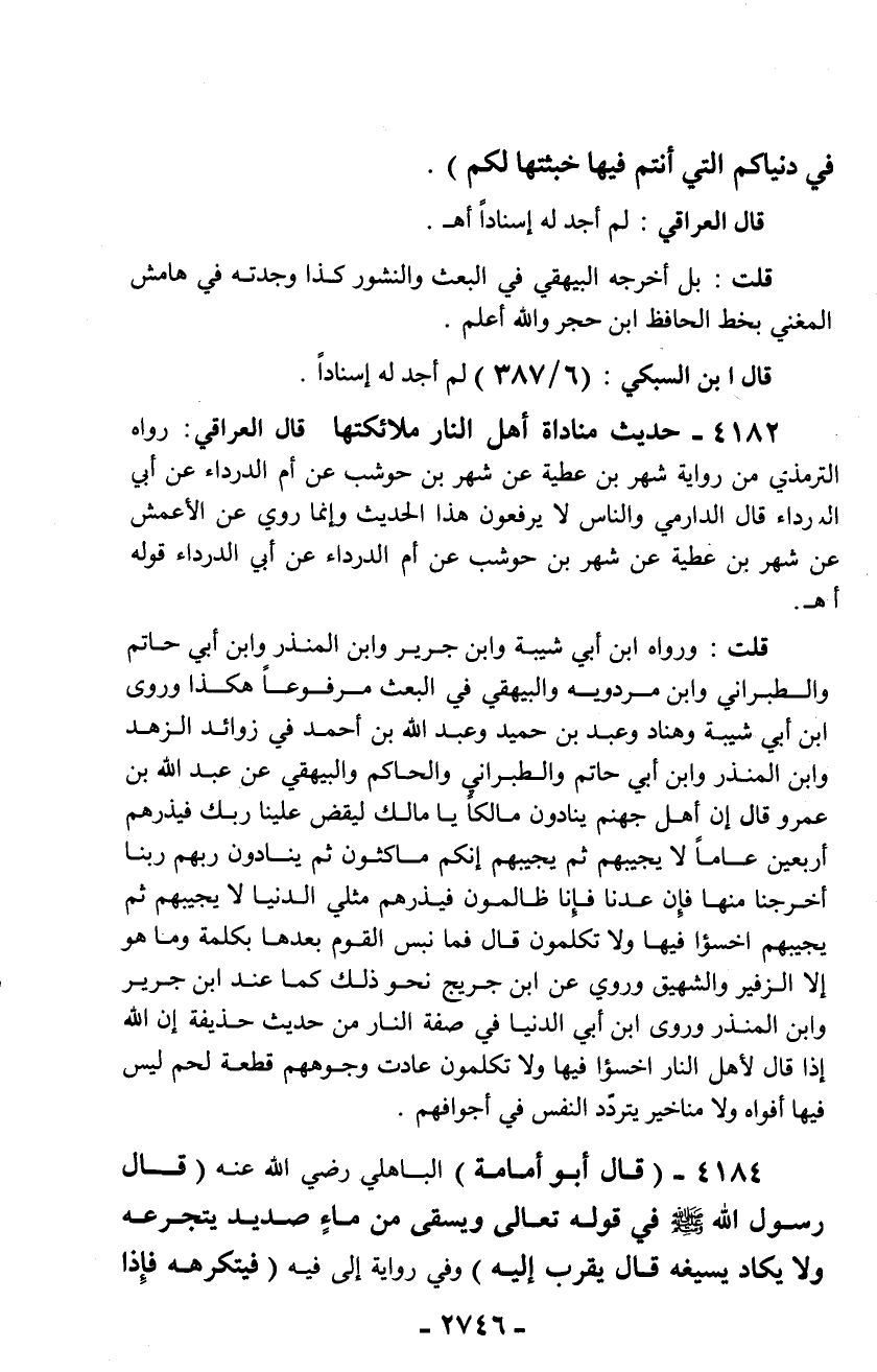 4182 - حديث مناداة أهل النار ملائكتها قال العراقي: رواه الترمذي من رواية شهر بن عطية عن شهر بن حوشب عن أم الدرداء عن أبي الدرداء قال الدارمي والناس لا يرفعون هذا الحديث وإنما روي عن الأعمش عن شهر بن عطية عن شهر بن حوشب عن أم الدرداء عن أبي الدرداء قوله أهـ.