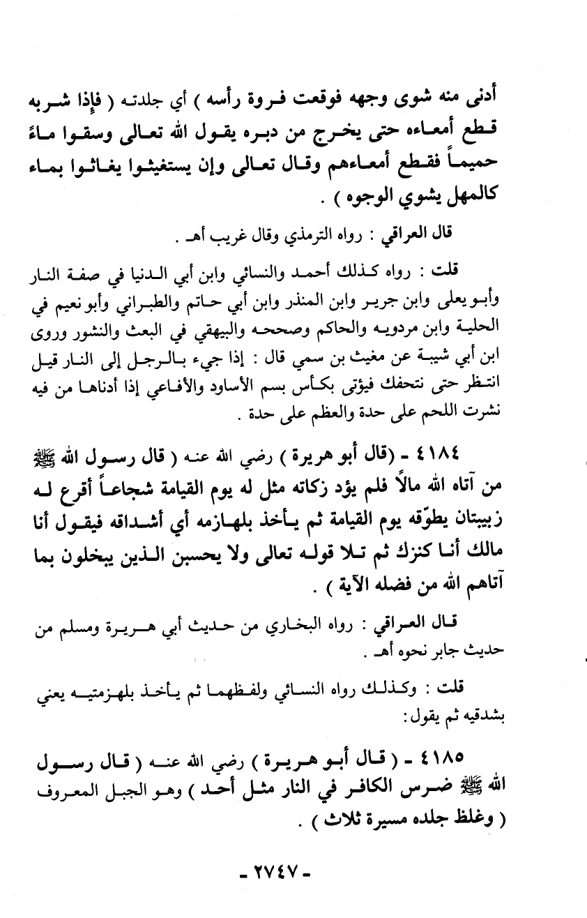 4184 - (قال أبو هريرة) رضي الله عنه (قال رسول الله - صلّى الله عليه وسلم - من آتاه الله مالاً فلم يؤد زكاته مثل له يوم القيامة شجاعاً أقرع له زبيبتان يطوّقه يوم القيامة ثم يأخذ بلهازمه أي أشداقه فيقول أنا مالك أنا كنزك ثم تلا قوله تعالى ولا يحسبن الذين يبخلون بما آتاهم الله من فضله الآية).