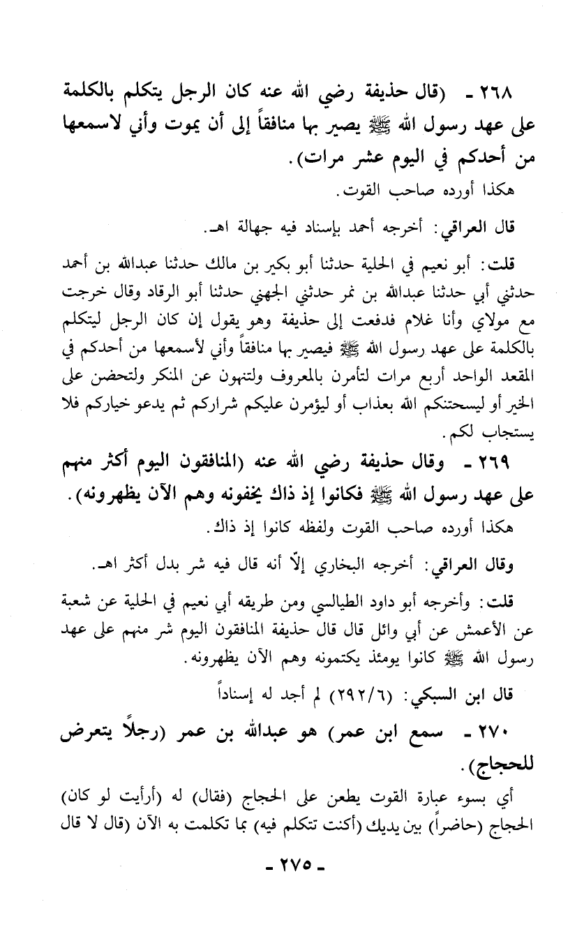 268 - (قال حذيفة رضي الله عنه كان الرجل يتكلم بالكلمة على عهد رسول الله - صلى الله عليه وسلم - يصير بها منافقاً إلى أن يموت وأني لأسمعها من أحدكم في اليوم عشر مرات).